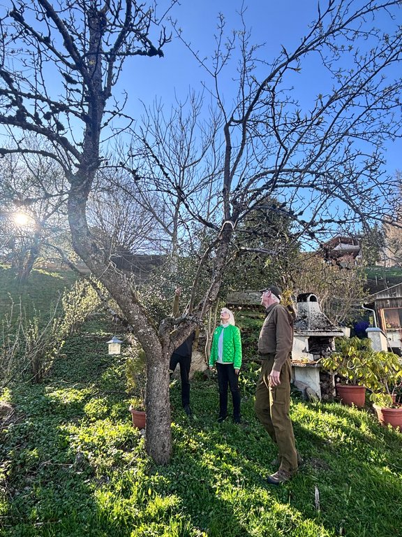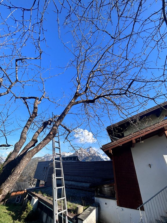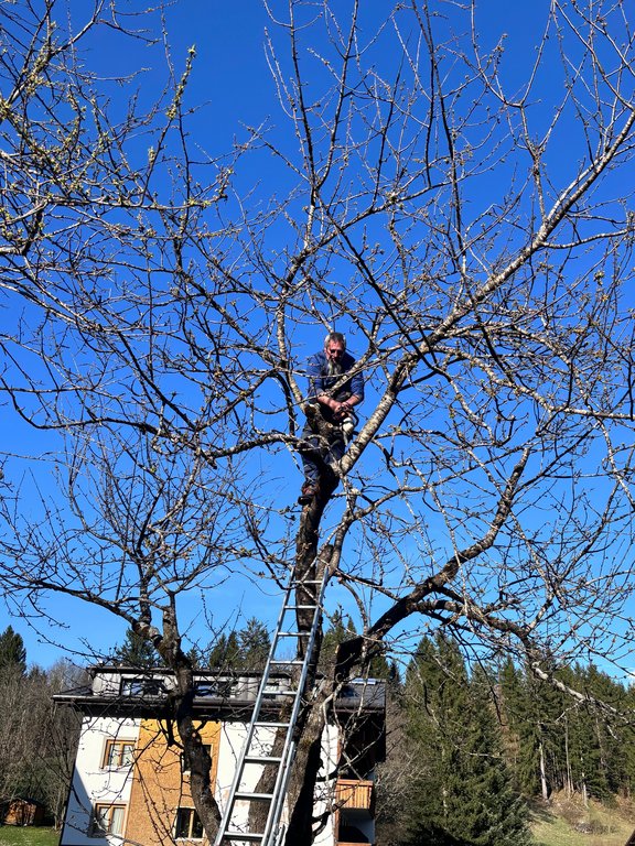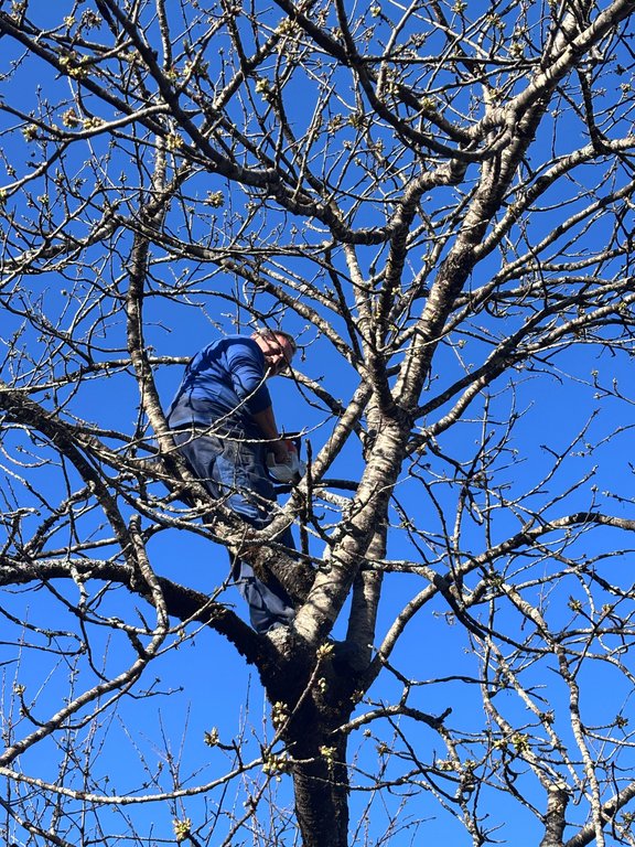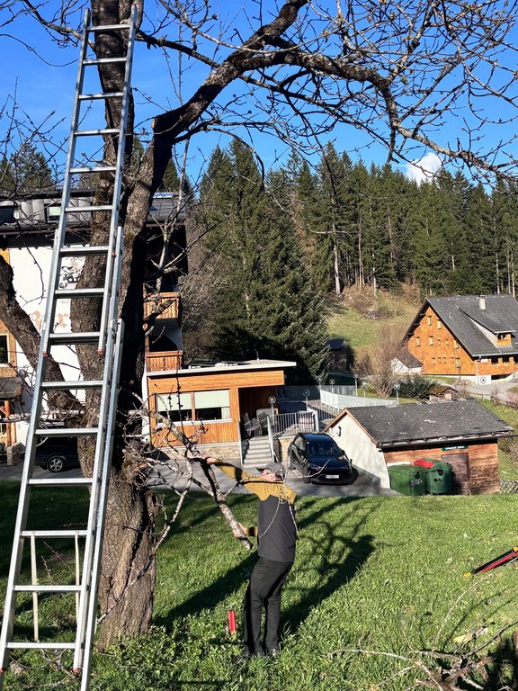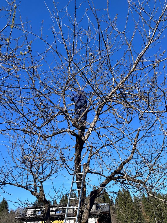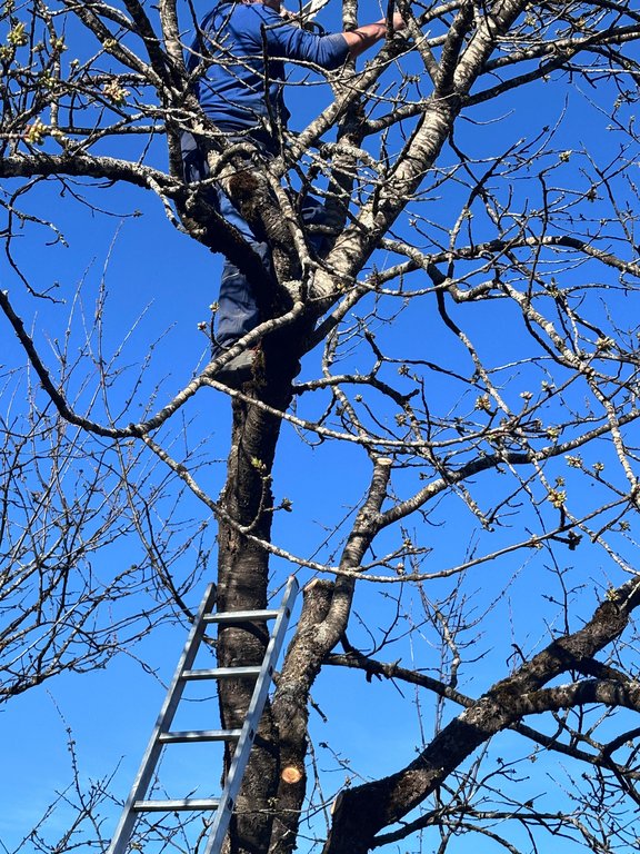 Im Mittelpunkt standen teils sehr alte Obstbäume, die einen kräftigen Rückschnitt benötigten. Mit sicherem Gespür für die richtige Schnittführung und beeindruckendem Einsatz in luftiger Höhe zeigten unsere Baumwärter ihr Können und ihre Kletterfertigkeit. Dabei wurde schnell klar: Ein guter Baumschnitt ist weniger eine Frage der Kraft, sondern vielmehr des Verständnisses für den Baum.
