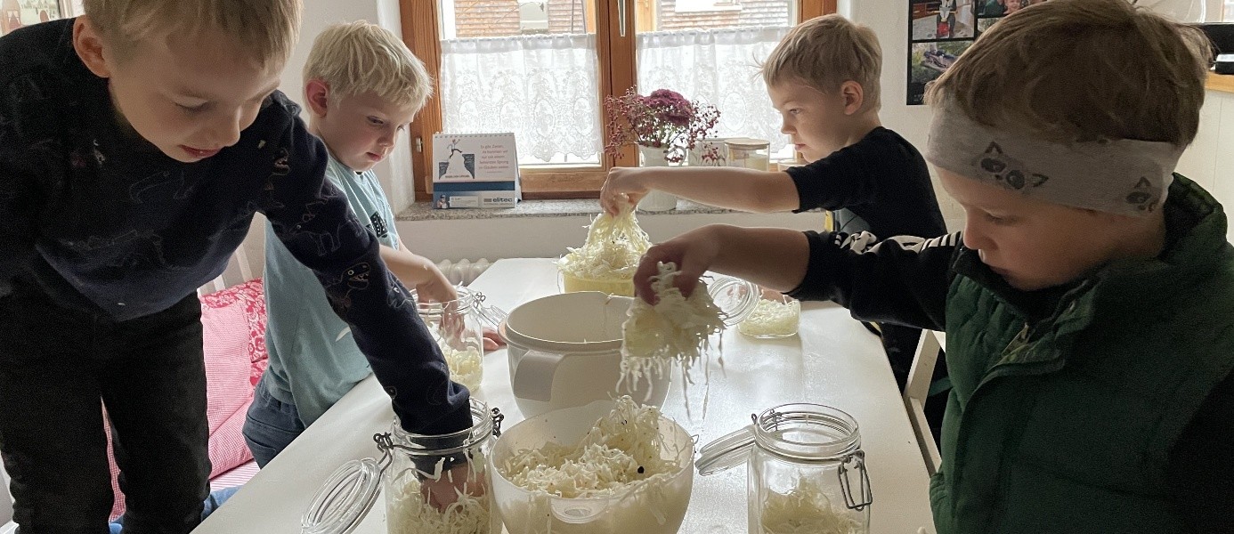 Wer kennt sie nicht, die Geschichte von der Witwe Bolte mit den beiden Lausbuben Max und Moritz. Wir verarbeiten mit Kindern Weißkohl im Glas zu leckerem Sauerkraut. Vergären bzw. Fermentieren von Lebensmitteln ist eine jahrtausendealte Technik zur Haltbarmachung von Gemüse, die wir den Kindern nahebringen möchten.