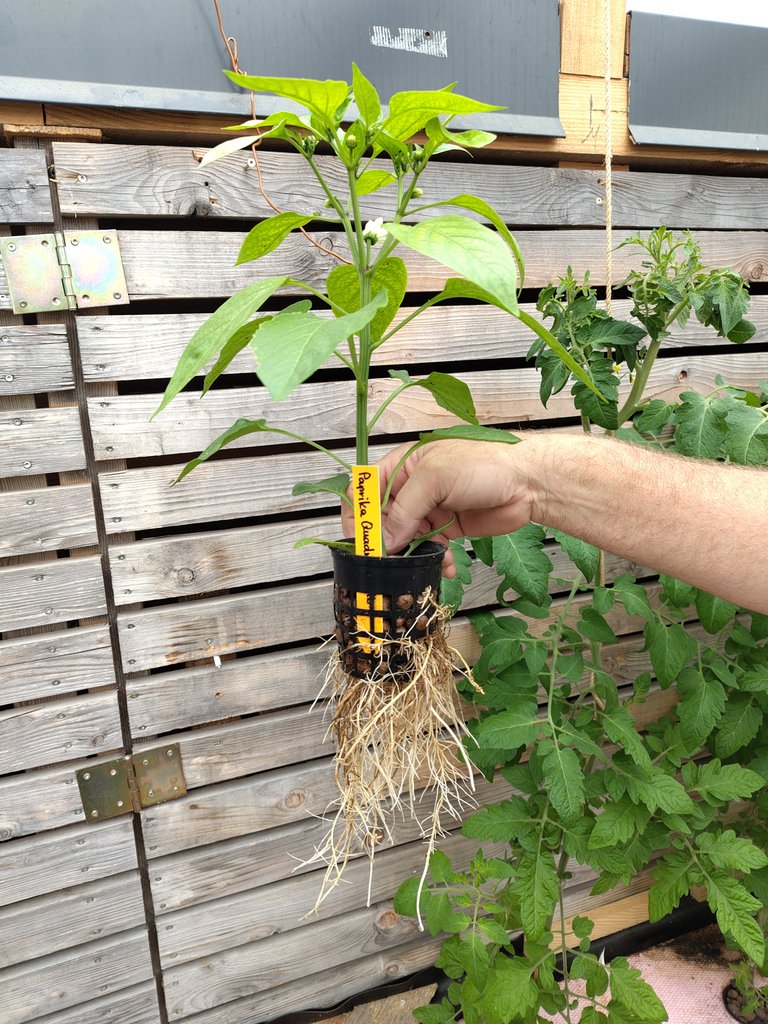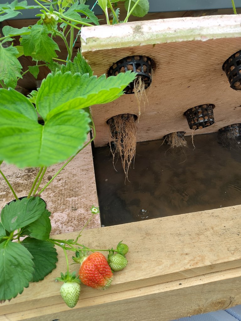 75 noch kleine afrikanische Raubwelse (Clarias gariepinus) konnten wir in den beiden Wasserbecken besichtigen. Das verkotete Grundwasser der beiden Becken wird durch einen Bürstenfilter und dann durch einen Mikrofilter geleitet und mit Sauerstoff angereichert. Von dort wird es nach oben, in das Gewächshaus gepumpt. Hier sind die Becken mit den Nutzpflanzen (Erdbeeren, Tomaten, Paprika, Gurken und vieles mehr). Das Wasser fließt nun durch Becken, die ca. 30 cm hoch sind. Abgedeckt sind sie mit Styroporplatten, um Wärme und Feuchtigkeitsverlust zu verhindern. Die topfgroßen Löcher im Styropor sind mit den Pflanzen, ohne Erde im Wurzelbereich, bestückt. Die Pflanzen befinden sich in Töpfchen mit Blähton. Die Wurzeln reichen ins Wasser. Wurden dem Wasser durch die Gemüsepflanzen die restlichen Nährstoffe entzogen, wird es wieder zurück ins Fischbecken geleitet. Wasserverlust wird durch Regenwasser wieder aufgefüllt.
