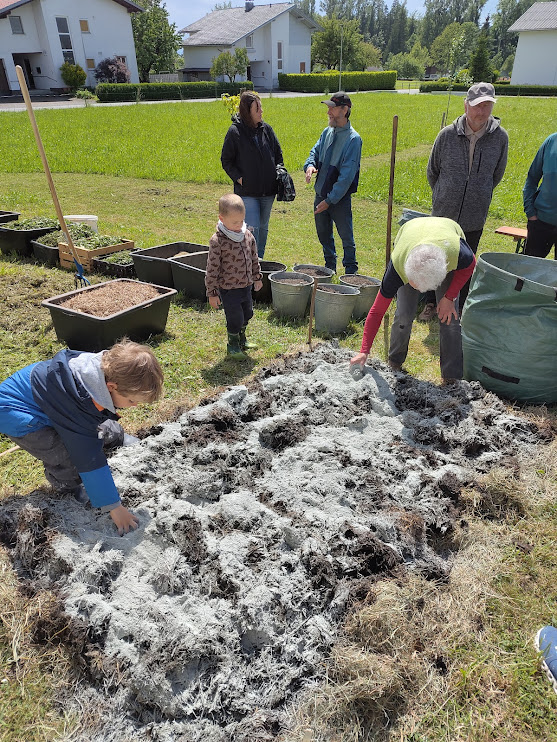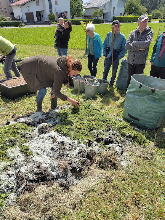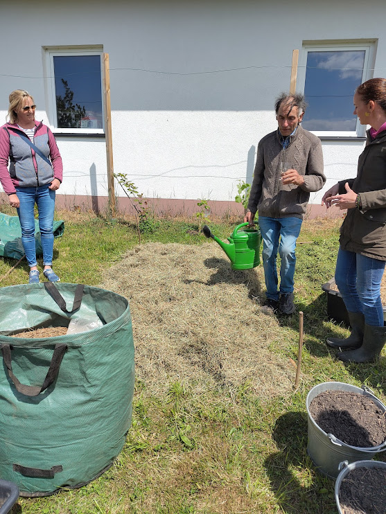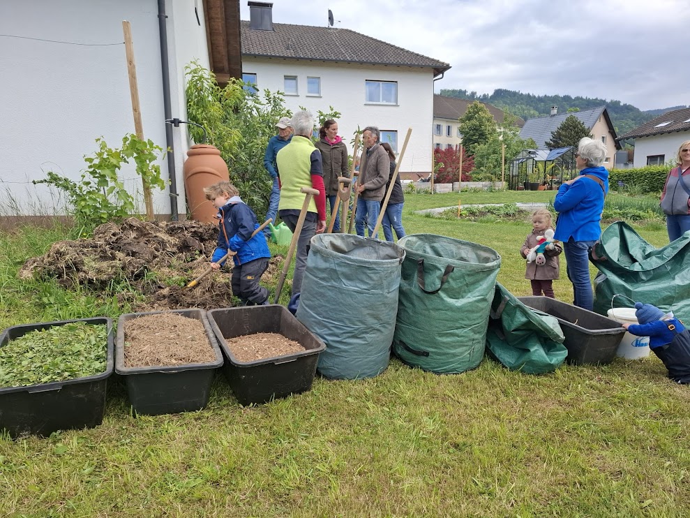 13 Personen tragen im großen Garten von Manuela Rasthofer in Hörbranz ein um das Kompostieren zu lernen.