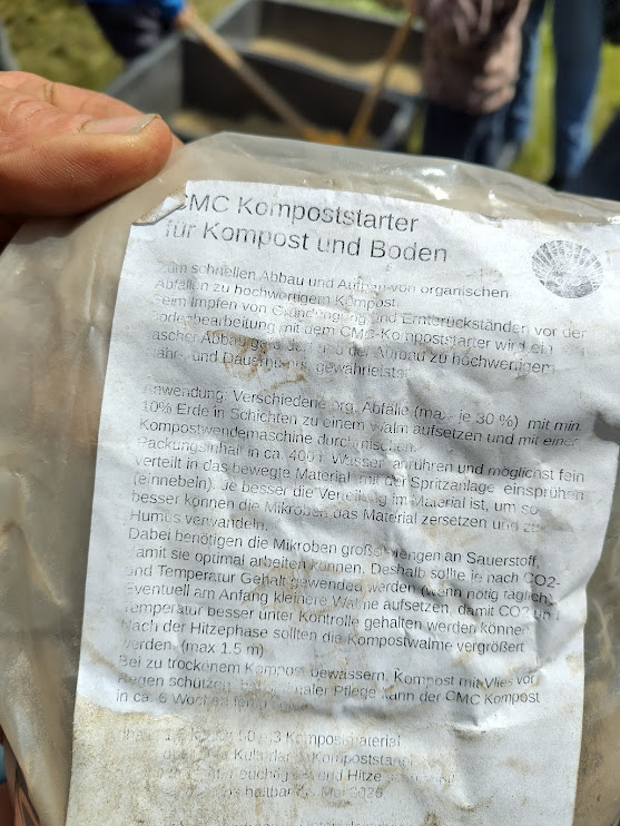 Es wurde die Größe des Komposthaufens abgesteckt und die Materialien, abwechselnd trockene und nasse Materialien, schichtweise zu einem Komposthaufen aufgeschichtet. Die einzelnen Schichten wurden mit der Gießkanne in welchem sich 1 Kaffeelöffel CMC Kompoststarter für Kompost und Boden befand befeuchtet.