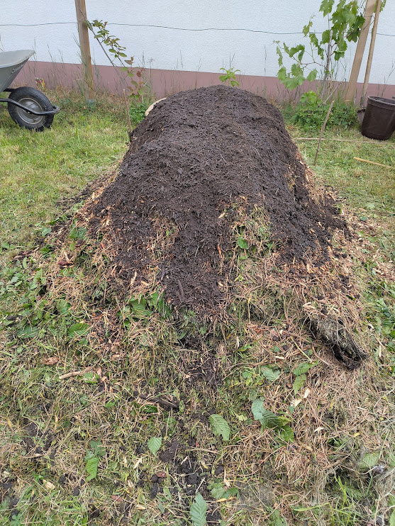 Anschließend wurde der Kompost gründlich vermischt. Mit der Mistgabel jeweils eine komplette Rinne bis zum Boden graben und das Äußere nach innen werfen, dann daneben die nächste Rinne graben.