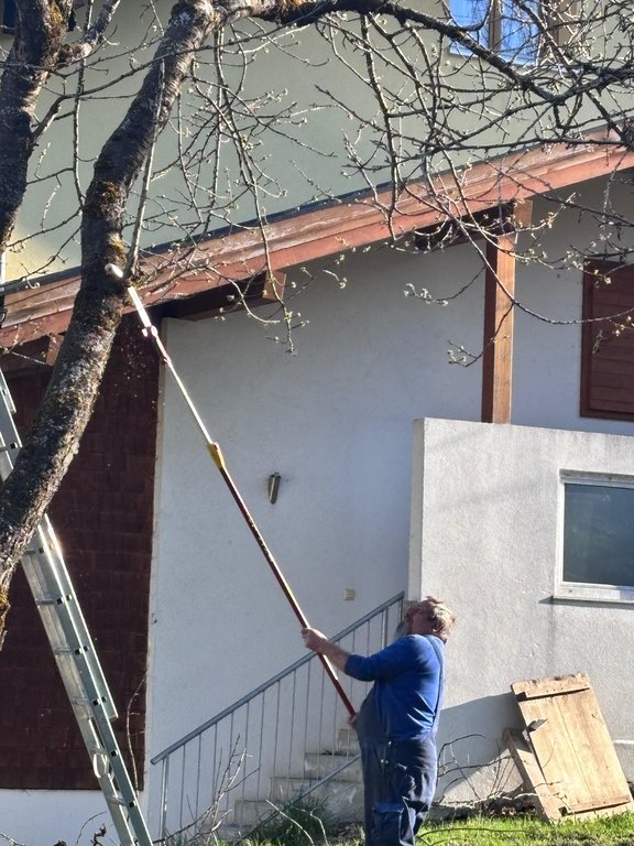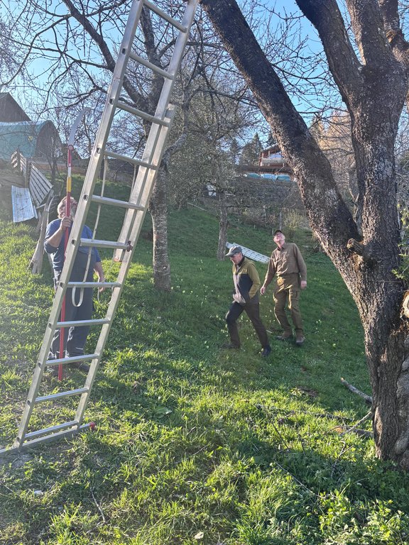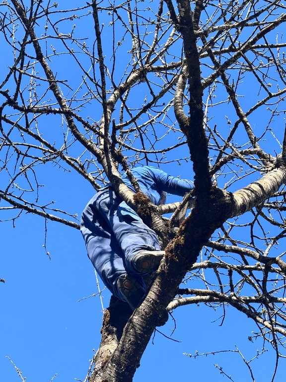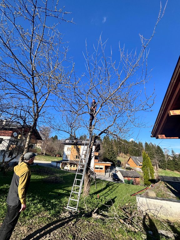 Im Mittelpunkt standen teils sehr alte Obstbäume, die einen kräftigen Rückschnitt benötigten. Mit sicherem Gespür für die richtige Schnittführung und beeindruckendem Einsatz in luftiger Höhe zeigten unsere Baumwärter ihr Können und ihre Kletterfertigkeit. Dabei wurde schnell klar: Ein guter Baumschnitt ist weniger eine Frage der Kraft, sondern vielmehr des Verständnisses für den Baum.
