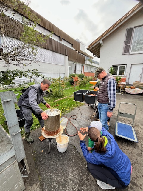 gemeinsam unter der fachgerechten Anleitung von Elmar Felder wurde das Obst verpresst