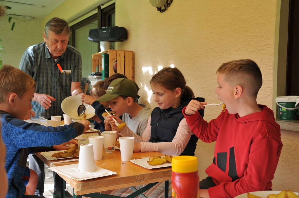 Am Ende der Führung durch den Garten gab es köstliche Wedges für die Kinder. Als kleines Geschenk bekamen sie verschiedene Trauben, Kartoffel und ein Zwiebelmännchen.