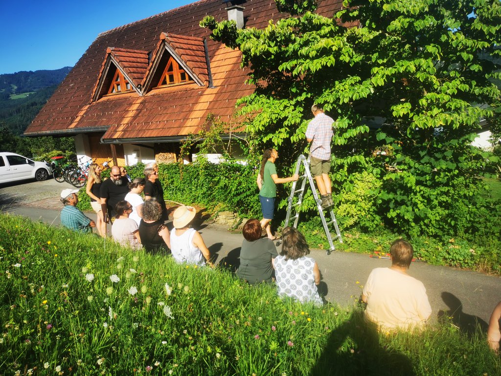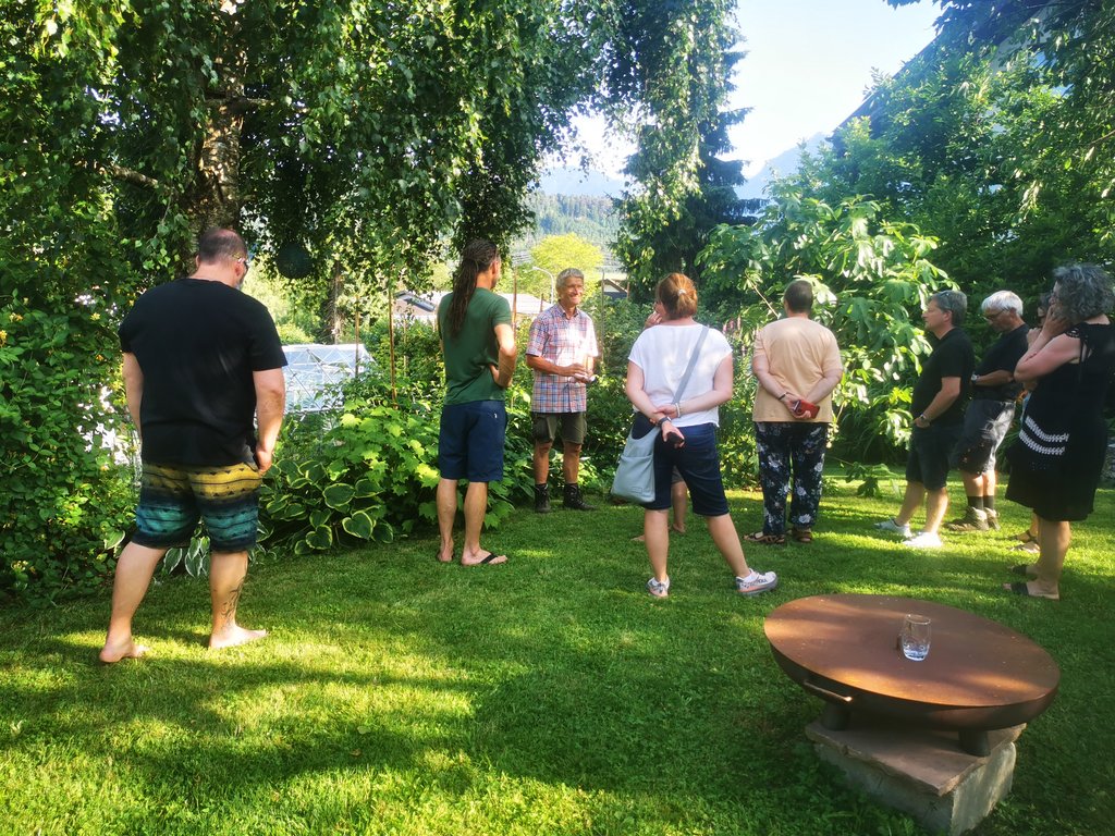 Trotz heißem Sommertag versammelte sich eine große Gruppe interessierter Gartenfreunde im Garten von Michael Furxer und Vanessa Morscher. Welche Atmosphäre große schattenspendende Bäume, rahmengebende Sträucher und Stauden die den Blick auf sich lenken ausstrahlt, durften wir gleich beim Betreten des Gartens erleben. So anmutend dieses Stadium des Gartens ist, so wichtig ist jetzt ein Rück-, Auslichtungs- und Verjüngungsschnitt. Gartenprofi Thomas Kopf erklärte uns dazu die möglichen Vorgangsweisen.Grundsätzlich ist nach der Blüte der richtige Zeitpunkt. Einen guten Einfluss hat auch der untergehende Mond. Ende Juni, wenn die Sträucher ihren Habitus erreicht haben und noch Zeit genug für einen Neuaustrieb haben, ist ebenfalls ein guter Zeitpunkt. Manchmal ist eine Standortänderung, an dem der Strauch seine natürliche Form entfalten kann, die bessere Lösung als ein Schnitt. Mit Leiter, Säge und Schere ausgerüstet zeigte uns Thomas wie man bei einem Auslichtungsschnitt praktisch vorgeht. Auch die richtige Pflege von Rispen- und Bauernhortensien war ein interessantes Thema. Zum Abschluss wurden wir von den Gastgebern zu einem gemütlichen Hock eingeladen, bei dem noch eifrig Gartenerfahrungen ausgetauscht wurden.
