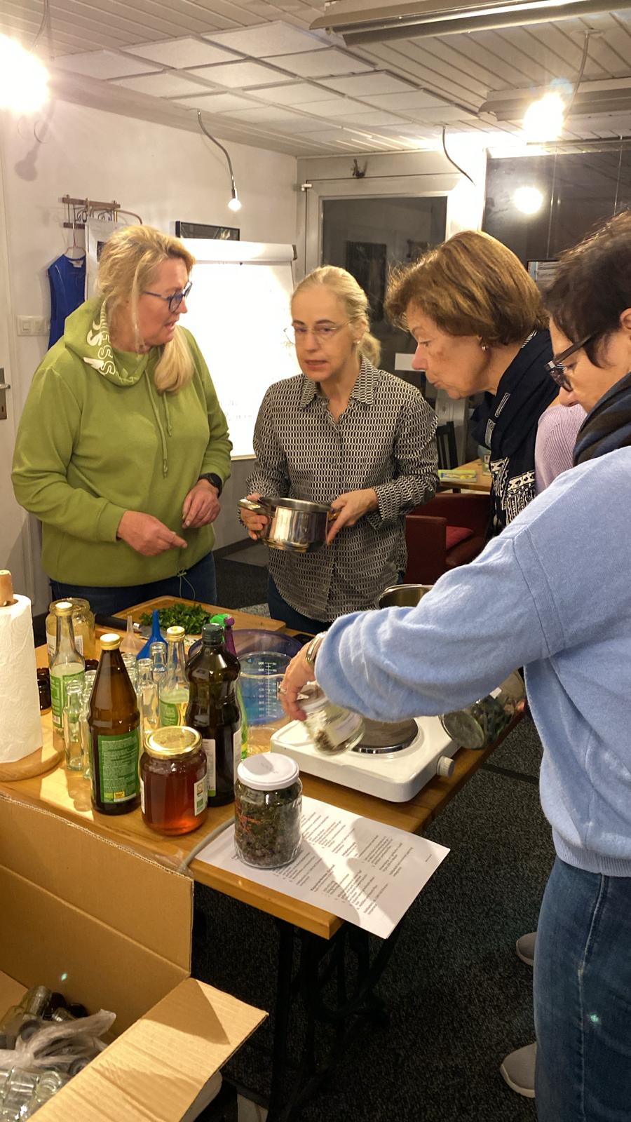 Im Mittelpunkt des Abends stand die natürliche Stärkung des Immunsystems in der kalten Jahreszeit. Unter dem Motto „altes Wissen neu entdeckt“ lernten die knapp 30 Teilnehmenden, wie man mit einfachen Zutaten aus der Naturapotheke – etwa Thymian, Zwiebel, Salbei, Honig oder Fichte – wohltuende Haus- und Heilmittel selbst herstellen kann.