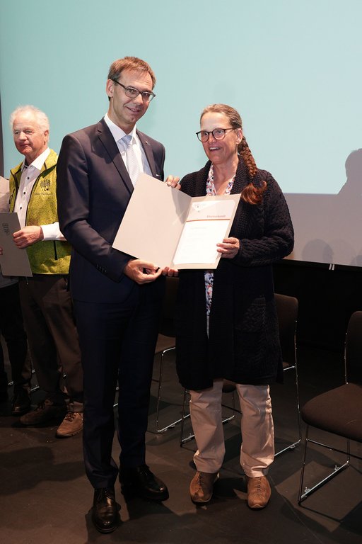 Im Beisein von rund 250 Gästen würdigte Landeshauptmann Wallner die Vielfalt und Bedeutung des Ehrenamts. Er zeichnete 55 Vorarlbergerinnen und Vorarlberger für ihren ehrenamtlichen Einsatz aus. Von Seiten des OGV erhielten Melitta Sohm aus Lochau und Harald Flecker aus Thüringen diese hohe Auszeichnung.