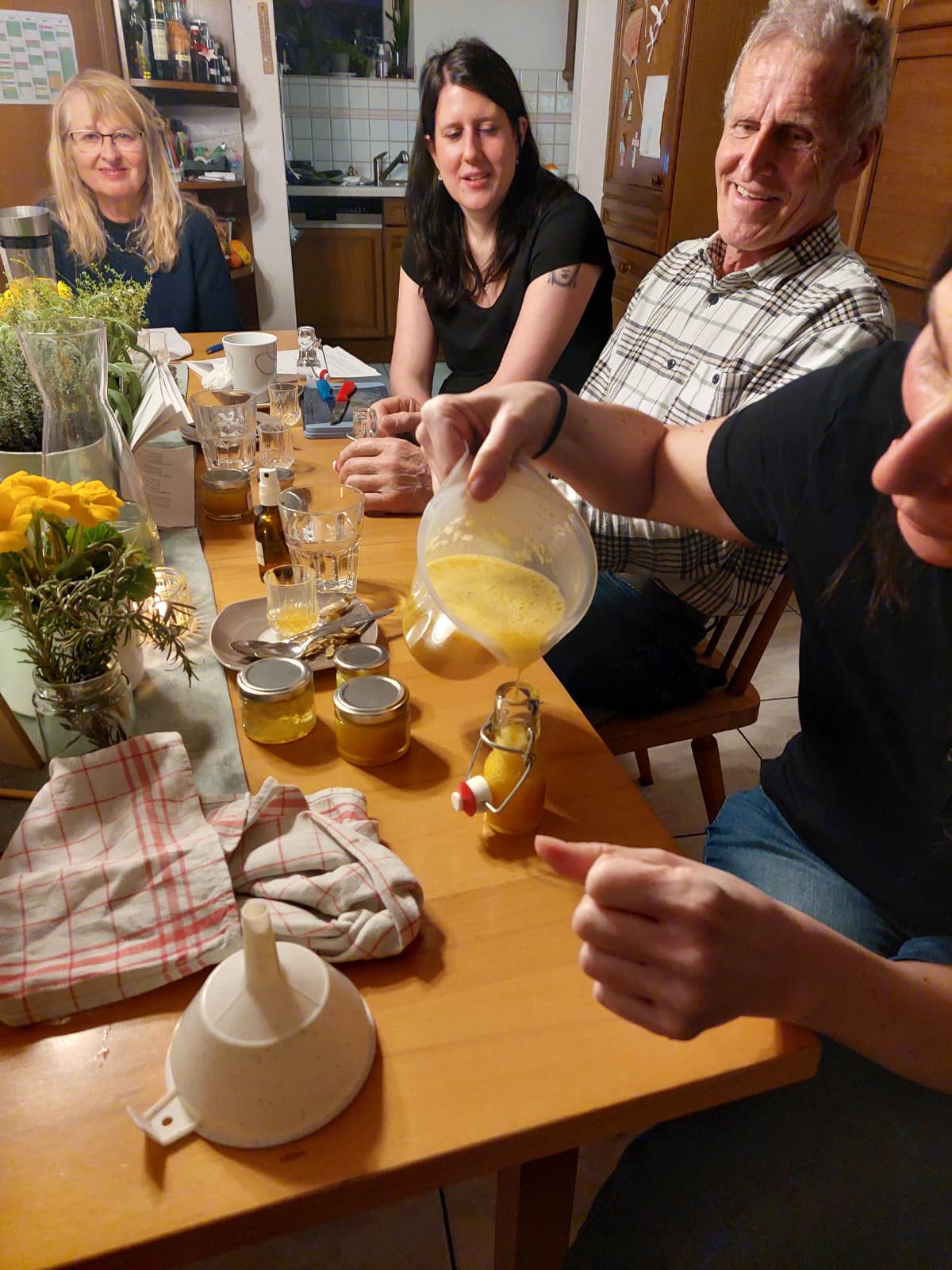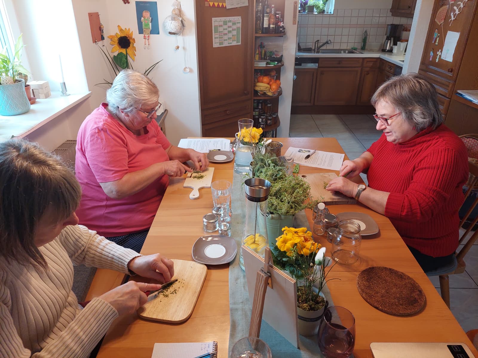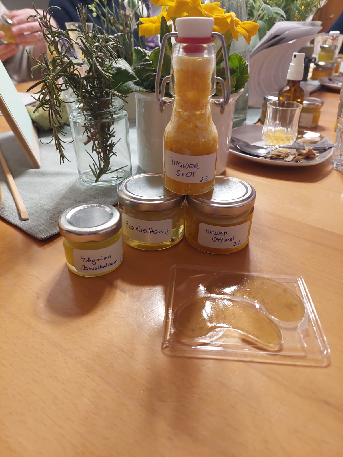 Unter fachlicher Anleitung wurden gemeinsam Augenpads mit Thymian und Kamille hergestellt, ein Thymianbrustbalsam gerührt, ein Zwiebel-Hustensirup angesetzt sowie ein Ingwer-Orangen-Shot und ein Ingwer-Kurkuma-Oxymel zubereitet. Dabei wurde nicht nur konzentriert gearbeitet, sondern auch viel gelacht. Der Austausch untereinander machte den Workshop besonders lebendig und interessant. Immer wieder sorgten kleine Experimente und Hintergrundinformationen für echte ah-Erlebnisse. So nahmen die Teilnehmenden nicht nur selbst hergestellte Naturprodukte, sondern auch wertvolles Wissen für die Erkältungszeit mit nach Hause.