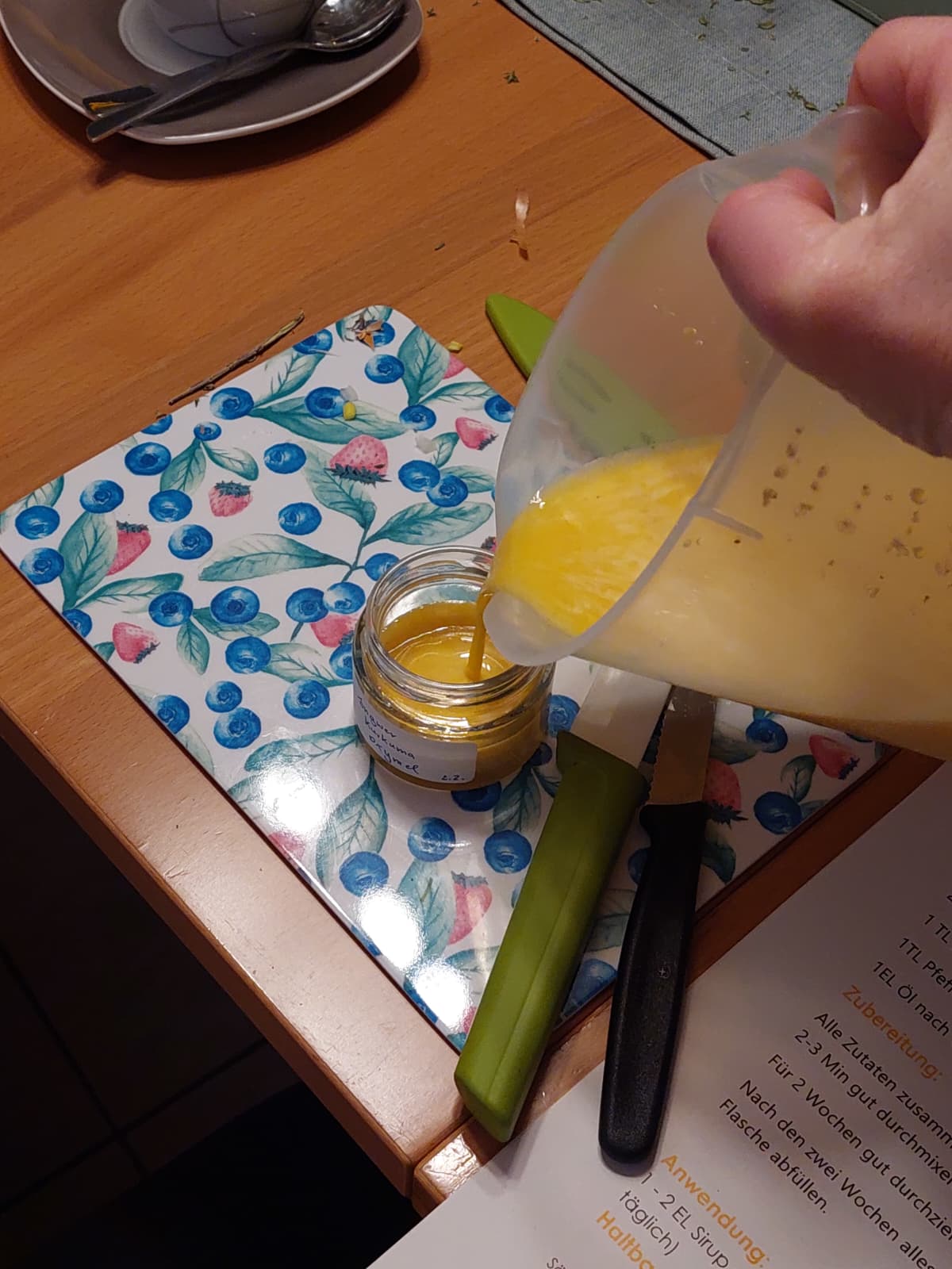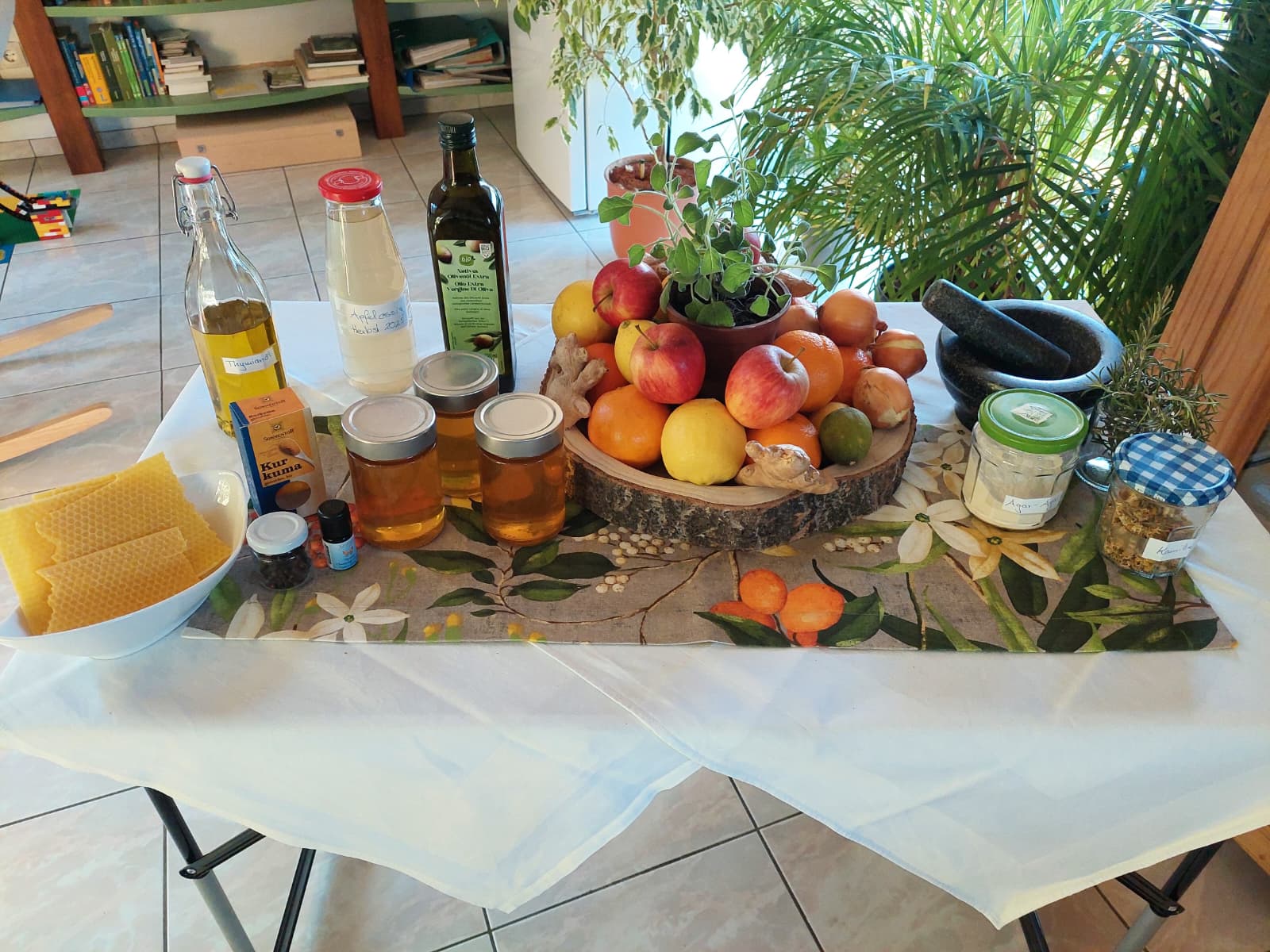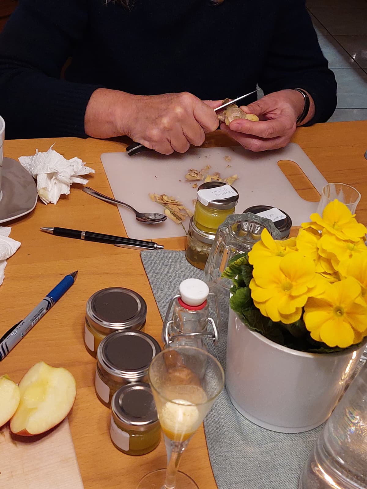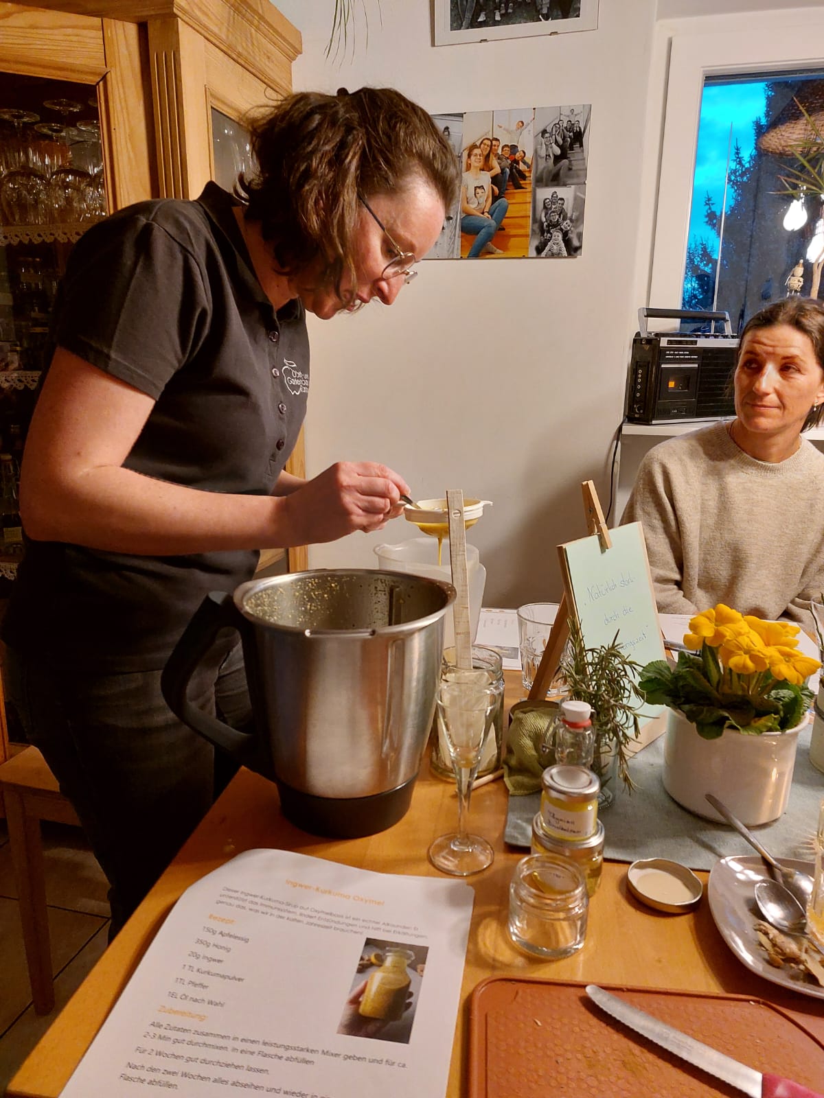 Unter fachlicher Anleitung wurden gemeinsam Augenpads mit Thymian und Kamille hergestellt, ein Thymianbrustbalsam gerührt, ein Zwiebel-Hustensirup angesetzt sowie ein Ingwer-Orangen-Shot und ein Ingwer-Kurkuma-Oxymel zubereitet. Dabei wurde nicht nur konzentriert gearbeitet, sondern auch viel gelacht. Der Austausch untereinander machte den Workshop besonders lebendig und interessant. Immer wieder sorgten kleine Experimente und Hintergrundinformationen für echte ah-Erlebnisse. So nahmen die Teilnehmenden nicht nur selbst hergestellte Naturprodukte, sondern auch wertvolles Wissen für die Erkältungszeit mit nach Hause.