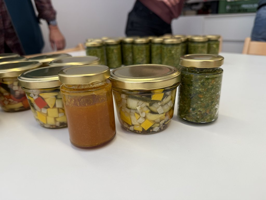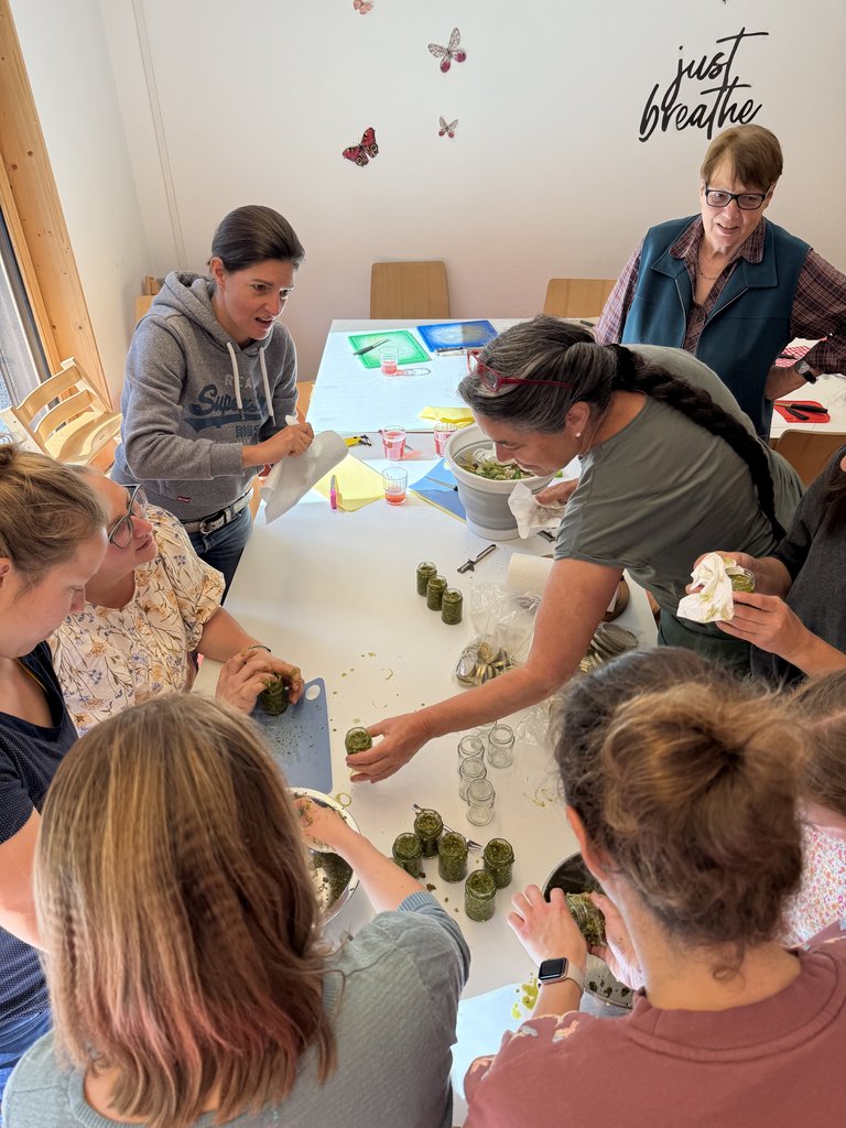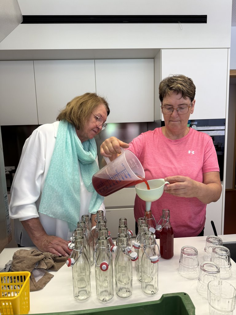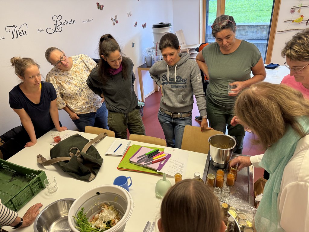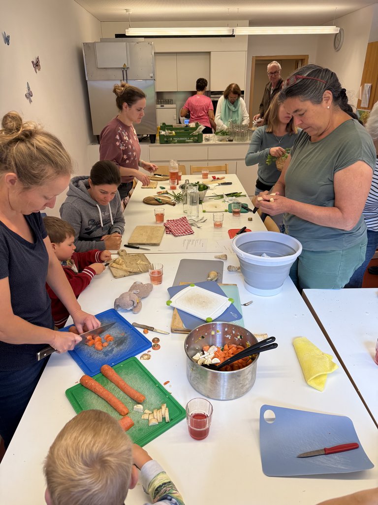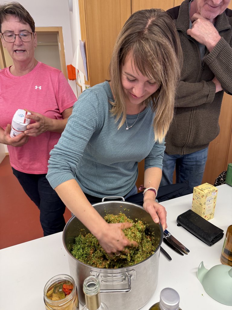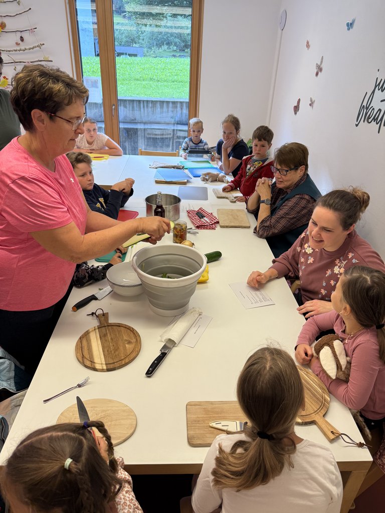 Gemeinsam mit Marianne Scheidbach wurde fleißig geschnippelt, gerührt und natürlich auch probiert. Aus Obst und Gemüse entstanden Saft, Marmelade, Pesto und eingelegte Köstlichkeiten. Besonders beliebt waren die kleinen Kostproben, die Marianne schon vorbereitet hatte – die kamen bei Groß und Klein richtig gut an.