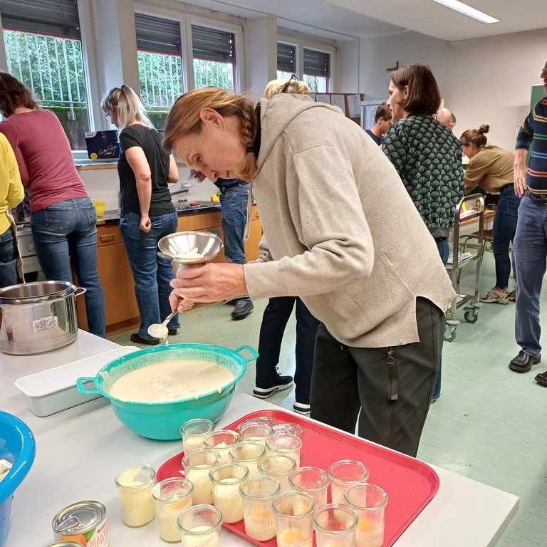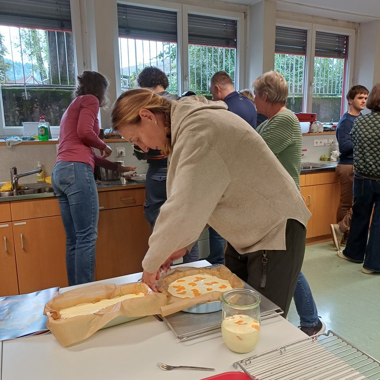 Im praktischen Teil wurde den ganzen Nachmittag über eifrig gearbeitet: Es wurde geschält, geschnitten, gekocht, gerührt und natürlich auch gekostet – unter anderem Kuchen im Glas, der großen Anklang fand. Für eine stärkende Pause sorgte eine frisch zubereitete Kürbissuppe, die allen schmeckte.