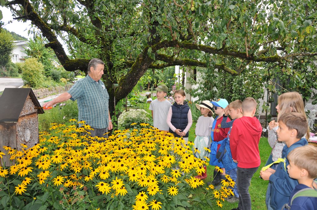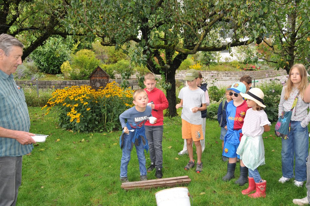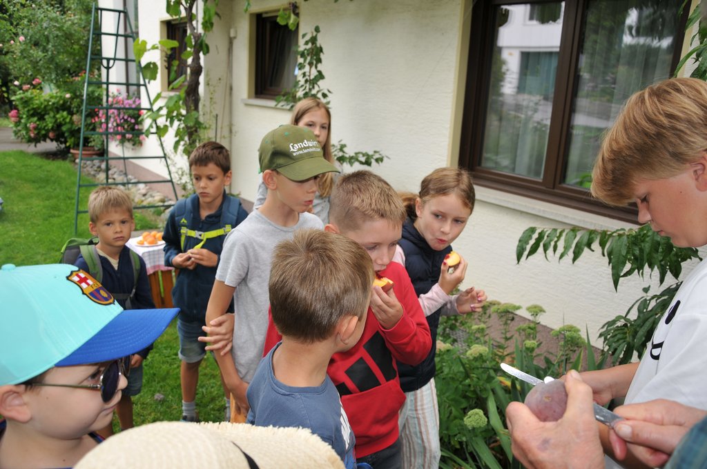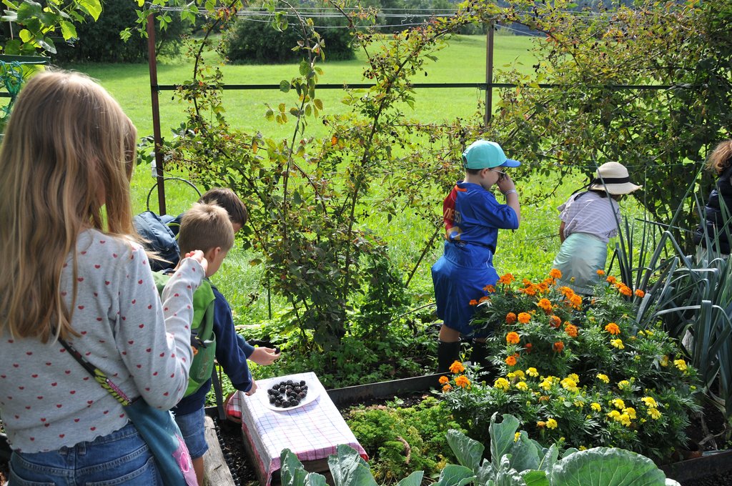 Mit viel Fachwissen und Leidenschaft führte Nikolaus Peer die Kinder durch den liebevoll angelegten Garten. Dabei erfuhren die jungen Teilnehmerinnen und Teilnehmer, wie Obst, Gemüse und Kräuter wachsen, wie man sie pflegt – und worauf man beim Ernten achten sollte. Probieren mit allen Sinnen war angesagt!