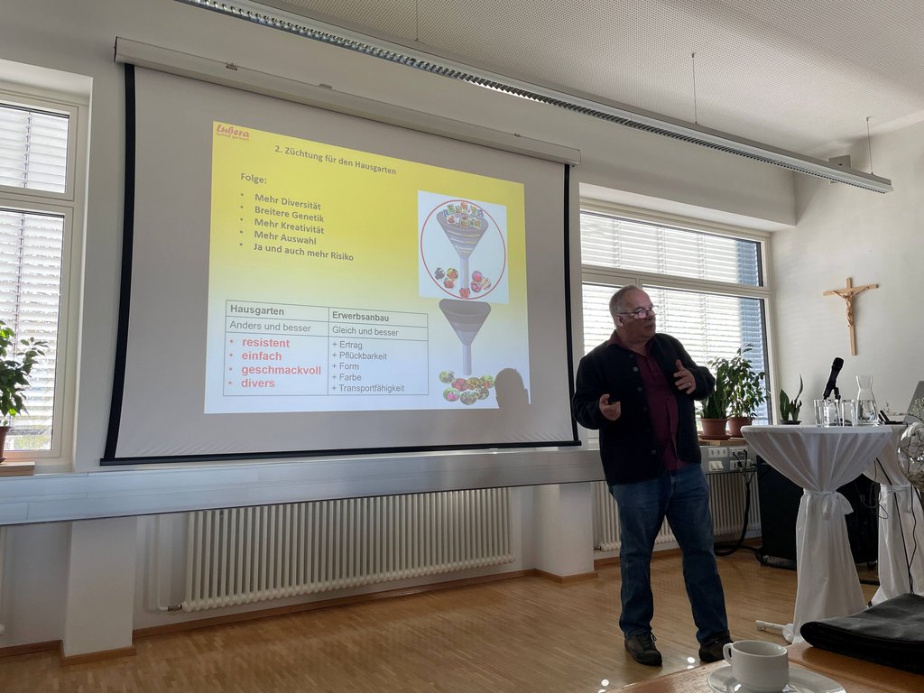 Im Anschluss präsentierte Franz Amort die brandneue Sortenfibel. Das Werk ist in zwei Teile gegliedert: Der erste Teil bündelt Artikel und Beiträge rund um die Themen Saatgut und Saatguterhaltung. Im zweiten Teil finden sich detaillierte Sortenbeschreibungen sowie ein Verzeichnis von Anbietern und Erhaltern verschiedenster Gemüse- und Obstpflanzen.