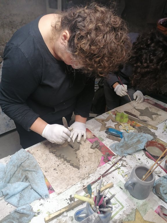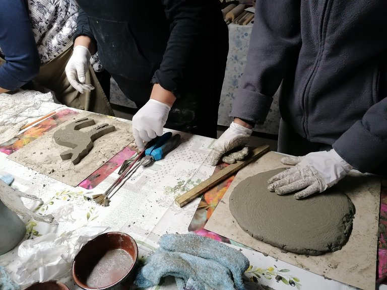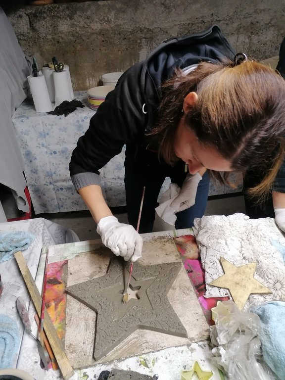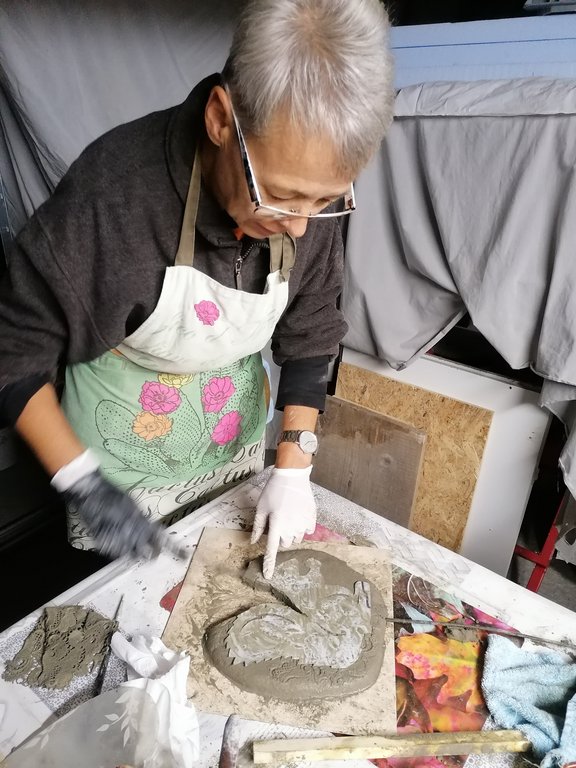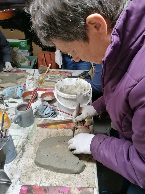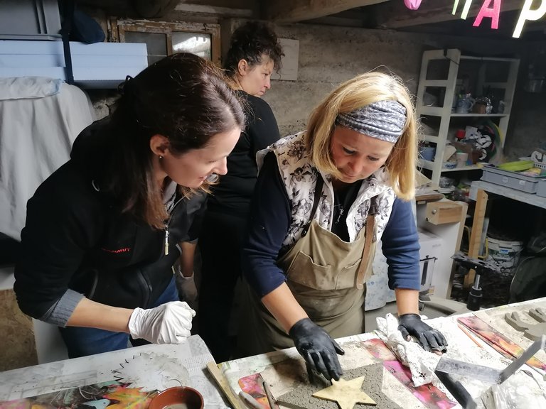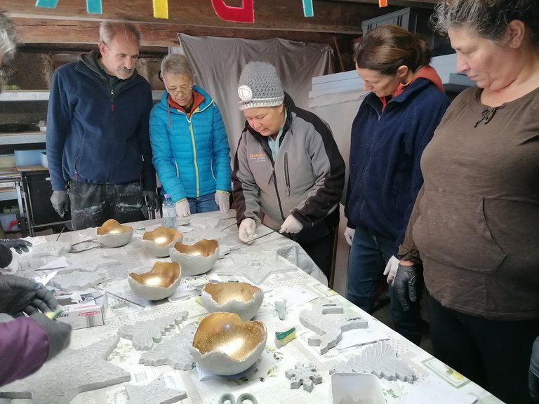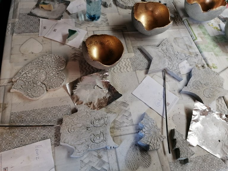 Platten, Schalen, Dekostecker entstanden unter der geduldigen und liebevollen Betreuung von Jeannette. Ihre Begeisterung für dieses Material ist ansteckend. Am ersten Kurstag formten wir unsere Objekte die dann getrocknet wurden. Jeannette nahm unsere Stücke aus der Form und bereitete sie für unseren 2.Kurstag vor. Sie entgratete sie solange die Kanten noch nicht ausgehärtet waren. Am 2. Kurstag bekamen die Kunstwerke noch ihren letzten Schliff, mit Farbe wurde dezent betont und fertig waren tolle Mitbringsel und Dekoartikel für den Garten.