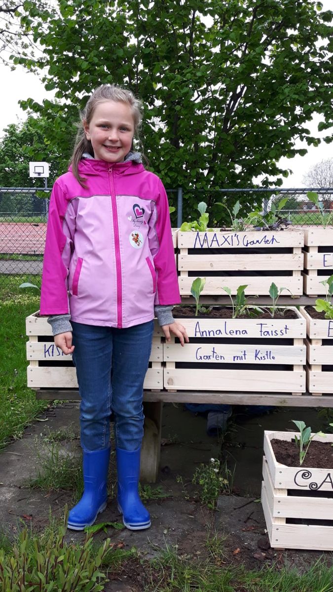 Draußem im Schulgarten wurden dann, unter Anleitung von Ruth, die Kisten mit Erde befüllt und individuell bepflanzt.