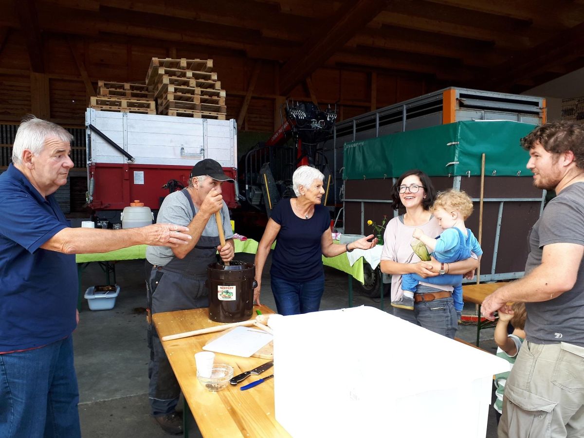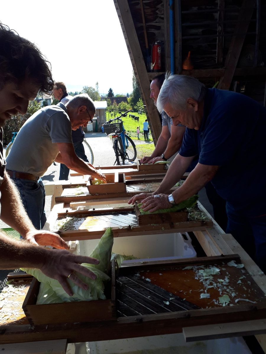 Der OGV Hörbranz hat sich um alle Zutaten und Gerätschaften, ausgenommen der Einmachbehältnisse, gekümmert. Ein großer Teil des Spitzkrautes kam direkt vom Acker beim Kloster Gwiggen.