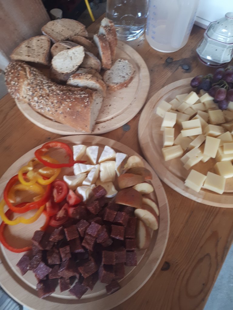 Die Krauthobel, Behälter und Gewürze waren schon vorbereitet. Für das leibliche Wohl war mit leckerer Brettljause, feinem Kuchen und frischem, sehr gutem Most gesorgt.