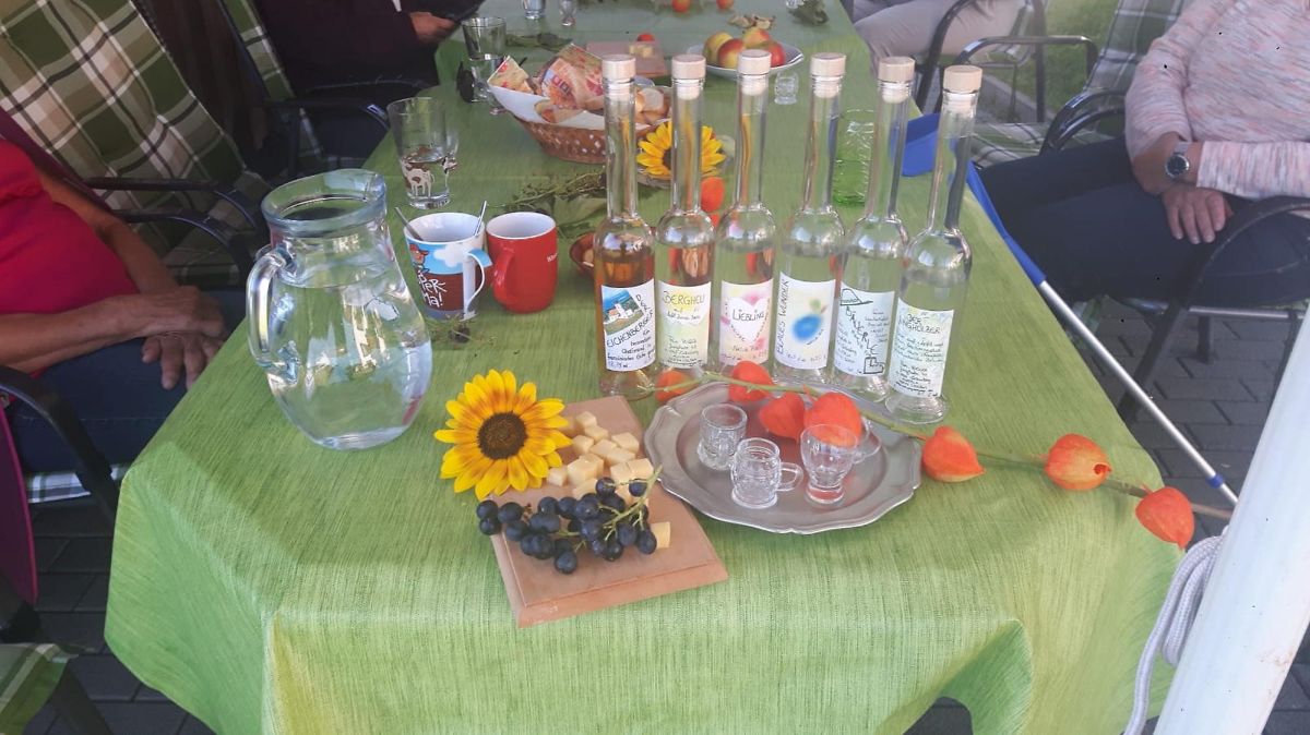 Erwin führte uns noch in sein Allerheiligstes, seinem Schnapsstübchen, wo es weitere Kostproben gab und er uns von seinen besonderen Kundschaften aus aller Welt erzählte. Auch der Papst trinkt Schnaps vom Eichenberg.