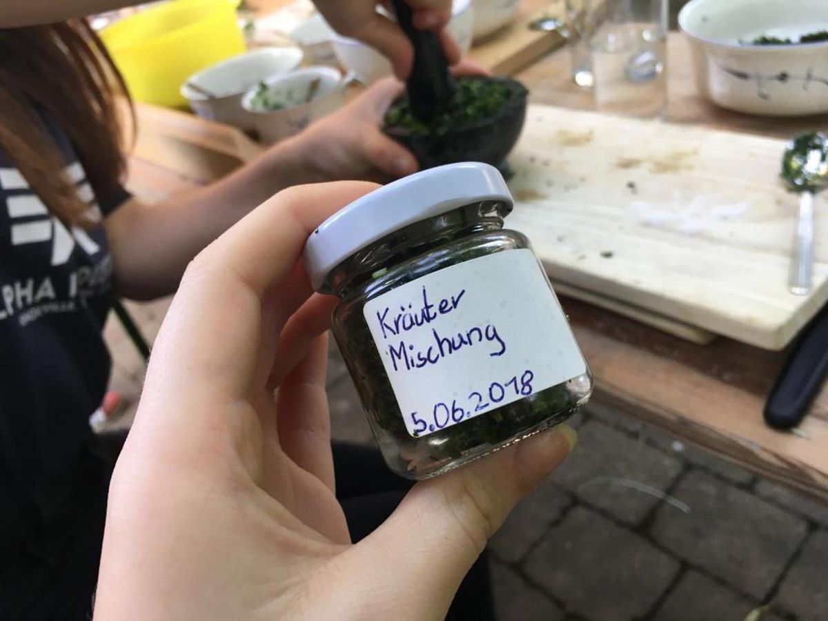 In der Zwischenzeit konnte jeder nach Wunsch seine eigene Mischung herstellen und mit Salz vermörsern. In kleine Gläser abgefüllt ist dies eine frische Kräutermischung die zu Salaten Suppen etc. verwendet werden kann.