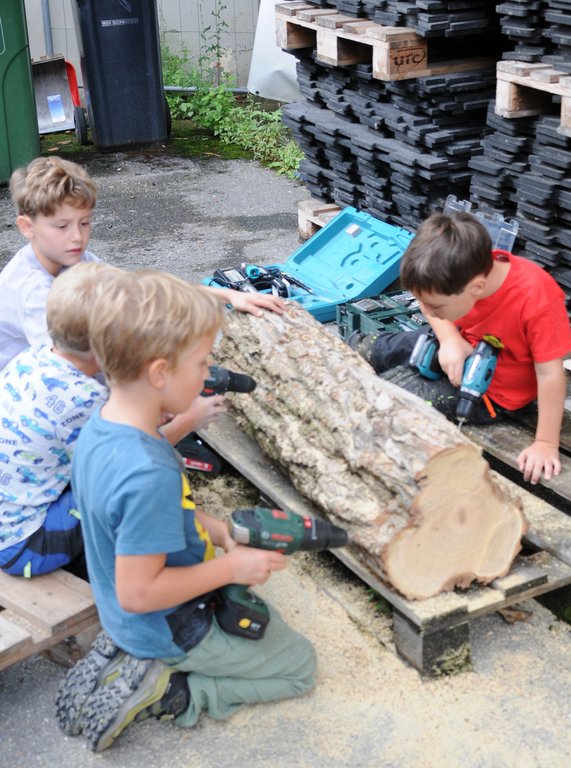 Es wurden mit Linda Ollmann Tonziegel getöpfert, Markhölzer und Markstängel fein säuberlich gesägt und abgeschliffen und ein massiver Robinienstamm vorgebohrt. Nur mit der Hilfe aller Anwesenden war das möglich, deswegen wurden kurzerhand auch Andreas Wally von der Gemeinde und der Fotograf Peter Steidl eingespannt.