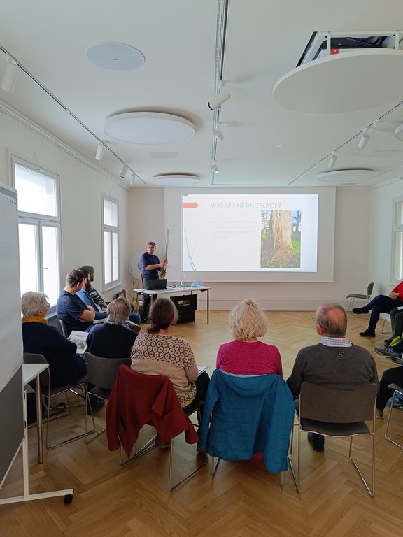 Am Vormittag vermittelte Kursleiter Michael Gunz zunächst die theoretischen Grundlagen. Dabei ging es um verschiedene Veredelungstechniken, die richtige Auswahl von Edelreisern sowie um die Voraussetzungen, damit aus Unterlage und Edelreis ein kräftiger, langlebiger Obstbaum entstehen kann. Die interessierten Teilnehmer:innen nutzten die Gelegenheit für zahlreiche Fragen und Diskussionen.