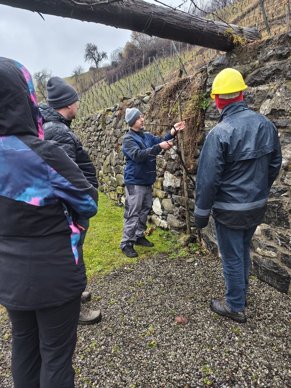 An einem Traubenstock an der Pergola Mauer wurde zudem die Erziehung von Spalierreben am Rankgerüst besprochen. Die Pflege der Ertragsreben zeigte sich anschaulich am Beispiel der Blauburgunder-Traube, bei der ein kräftiger Trieb horizontal befestigt wird.