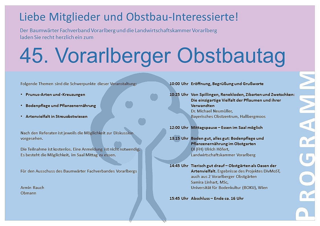 Wir laden herzlich zum 45. Obstbautag ein – einem Tag voller Fachwissen, Austausch und Inspiration rund um den Obstbau. Die Schwerpunkte der diesjährigen Veranstaltung reichen von der beeindruckenden Vielfalt der Prunusarten über praktische Ansätze zur Bodenpflege und Pflanzenernährung bis hin zur Förderung der Artenvielfalt in Streuobstwiesen.