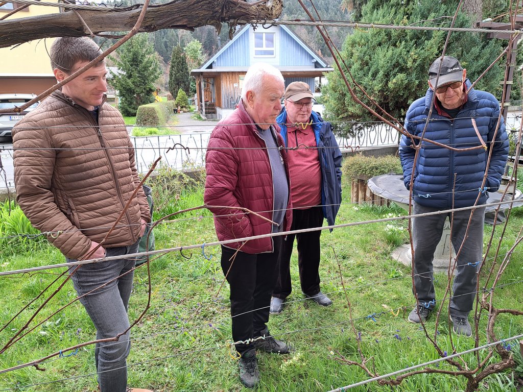 Im Garten von Baumwärter und Kursleiter Dieter Mähr in der Kaiserstraße fanden sich interessierte Rebenbesitzer ein, um sich über den fachgerechten Schnitt von Weinreben zu informieren. Anhand von Schautafeln konnte Dieter Mähr den Werdegang eines Rebstockes vom richtigen Setzen bis zur Schnittführung der Folgejahre eindrücklich aufzeigen. Anschließend erfolgte der praktische Teil: es wurde ein neuer Weinstock gepflanzt und die Spalierreben an der Pergola geschnitten.