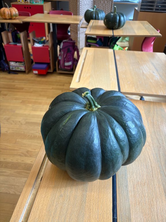 Im Frühjahr erhalten die Kinder einen Kürbissetzling, den sie über den Sommer hinweg mit viel Sorgfalt und Geduld pflegen. Gießen, beobachten, staunen – und hoffen, dass der eigene Kürbis wächst und gedeiht.