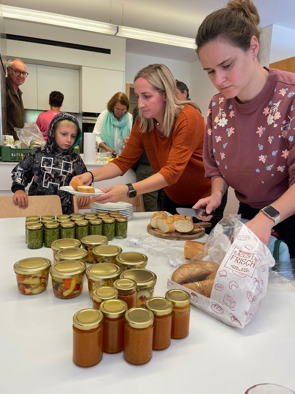 Gemeinsam mit Marianne Scheidbach wurde fleißig geschnippelt, gerührt und natürlich auch probiert. Aus Obst und Gemüse entstanden Saft, Marmelade, Pesto und eingelegte Köstlichkeiten. Besonders beliebt waren die kleinen Kostproben, die Marianne schon vorbereitet hatte – die kamen bei Groß und Klein richtig gut an.
