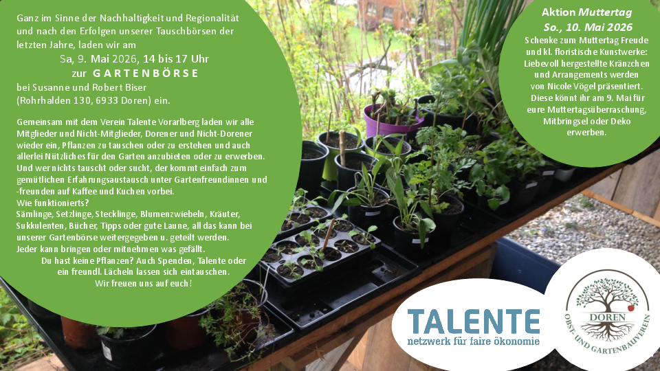 Gemeinsam mit dem Verein Talente Vorarlberg (dein Netzwerk für regionales, faires und nachhaltiges Wirtschaften in Vorarlberg) laden wir alle Mitglieder und Nicht-Mitglieder, Dorener und Nicht-Dorener wieder ein, Pflanzen zu tauschen oder zu erstehen und auch allerlei Nützliches für den Garten anzubieten oder zu erwerben.