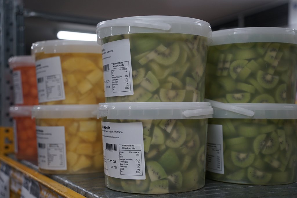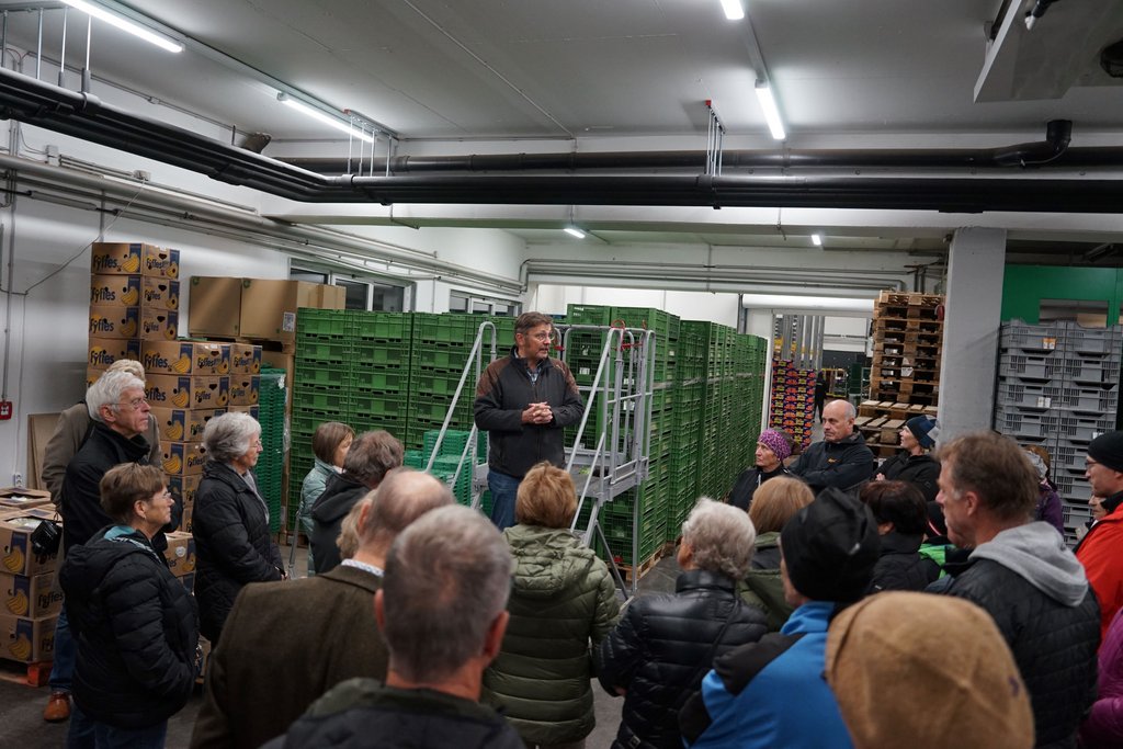 Hubert führte und durch die verschiedenen Kühl- und Arbeitsräume und stellte dabei das umfangreiche Sortiment vor. Von Früchten aller Art über Milch- und Fleischprodukte, Fisch bis zu Gewürzen reicht das Angebot.