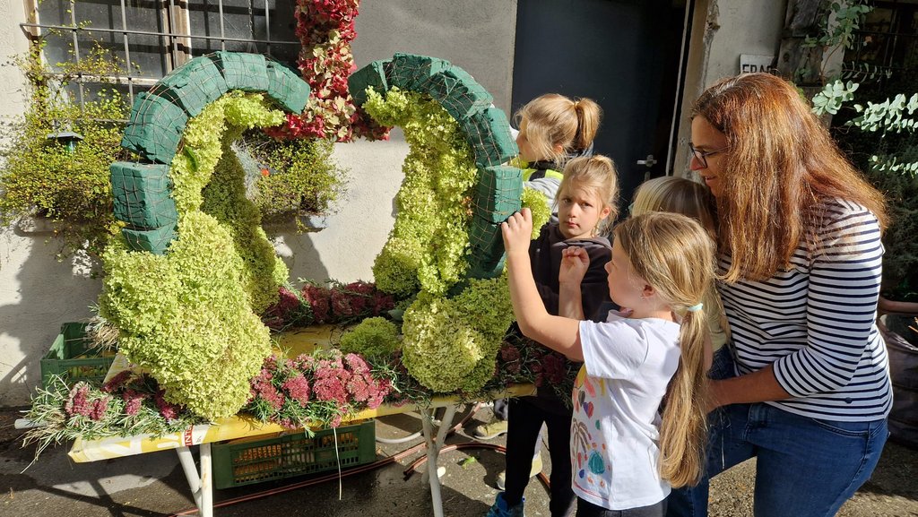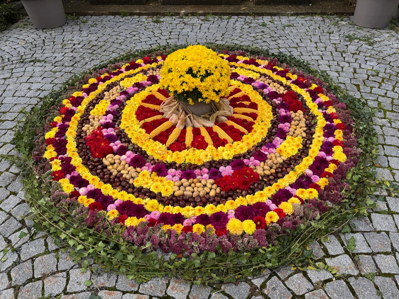 Sie gestaltete vor der Pfarrkirche einen beeindruckenden Teppich aus Blumen, Kartoffeln, Maiskolben und Kastanien.