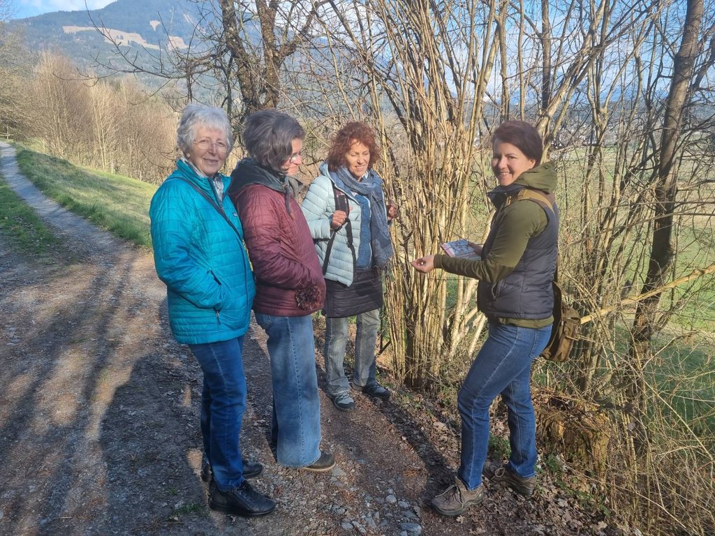Im Anschluss folgte der praktische Teil: Ein etwa 1,5-stündiger Knospenspaziergang in Satteins entlang am alten Römerweg. Die Teilnehmer lernten in der Natur, wie man Bäume und Sträucher im unbelaubten Zustand anhand ihrer Knospen sicher bestimmen kann. Frau Tiefenthaler gab dabei wertvolle Tipps zum behutsamen Sammeln und zur direkten Anwendung im Alltag.