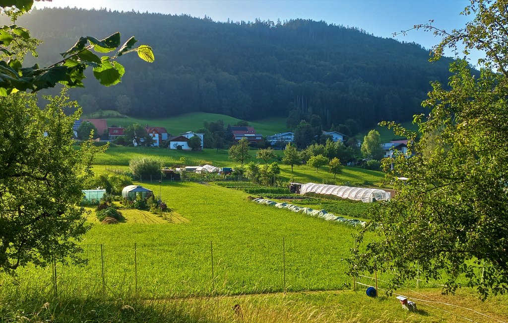 Zuerst wurden wir von Karin Bösch durch das liebevoll gepflegte und gestaltete Gartenparadies der Familien Bösch/Morscher geführt. Mit einer Vielzahl an Gemüsepflanzen, Beerensträucher und Obstbäumen sorgt sie für gesunde Ernährung ihrer großen Familie sowie ihrer Eltern. Auch die entspannende Beschäftigung in und mit der Natur ist mit ein Motivationsgrund. Ihr ist auch eine schöne Gestaltung wichtig, was an vielen Dekorationsdetails unschwer zu erkennen ist. Obwohl es vor Ort einen Brunnen gibt, wird beim Bewässern möglichst gespart, maximal 3mal wöchentlich muss reichen. Hilfreich ist dabei auch, dass alle bepflanzten Flächen gemulcht, bzw. bedeckt sind. Sie räumt allerdings ein, dass es ihr nur durch Mithilfe von Familie und Eltern möglich ist, neben Familie und Beruf das große Areal zu bewirtschaften.