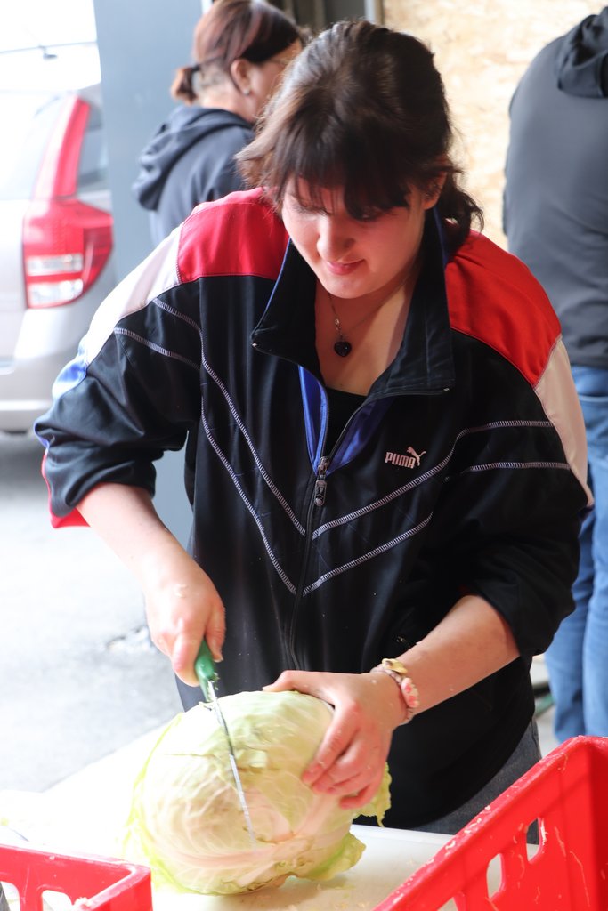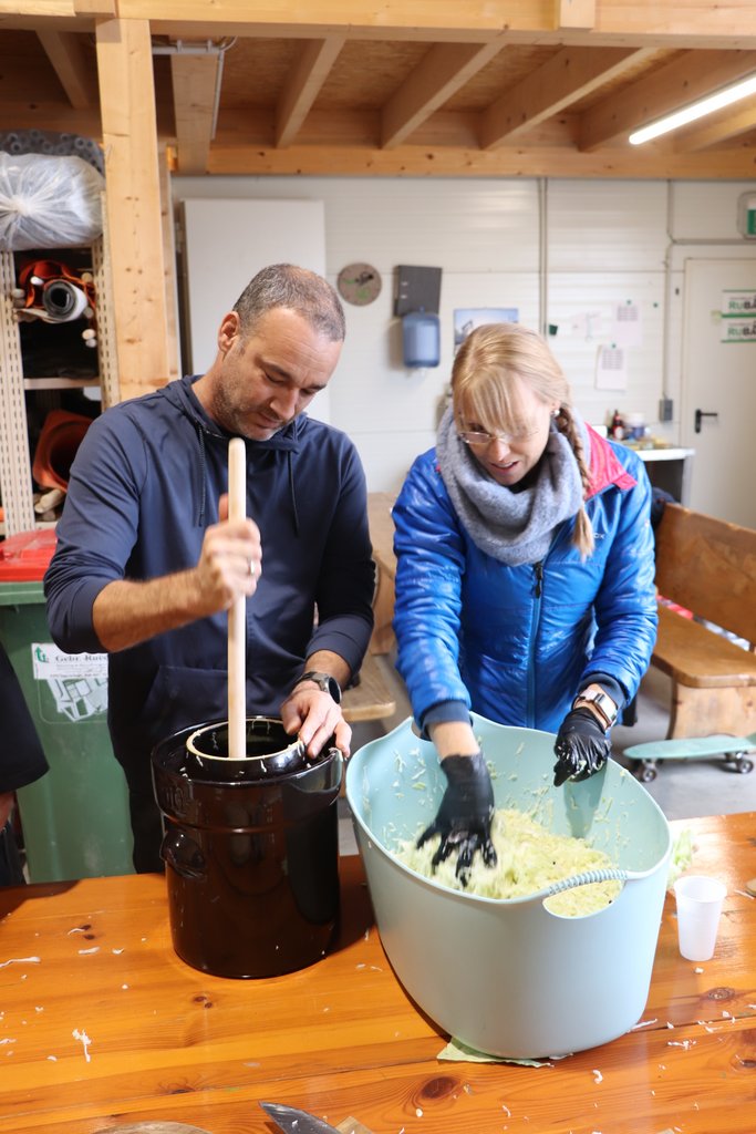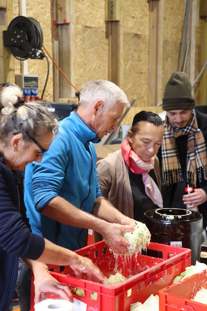 Der Ablauf war bestens organisiert: Zum Auftakt gab es eine kurze Einführung in die Kunst der Sauerkrautherstellung, bevor eifrig geschnippelt, gehobelt und gemischt wurde.Kraut, Hobel und Gewürze wurde vom Verein zur Verfügung gestellt.