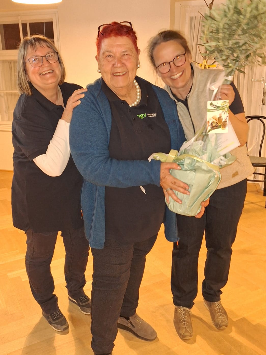 Angelika und Melitta geben einen amüsanten Rückblick auf Ruths jahrzehntelange Zeit im Verein, ernennen sie zur Ehrenobfrau und überreichen der Geehrten ein Olivenbäumchen. Ruth Heidegger begrüßt den inzwischen dazugestoßenen BM von Hohenweiler, Wolfgang Langes. BM Wolfgang Langes begrüßt die Anwesenden und schließt sich den Ehrungen an. Er dankt Ruth Heidegger für ihre Loyalität und Unterstützung als Obfrau des Vereins und überreicht ihr eine Anerkennung von Seiten der Gemeinde. Bernd Pulsinger dankt Ruth für die langjährige Zusammenarbeit mit dem OGV Hörbranz und überreicht ihr ebenfalls ein Geschenk. Der Bezirksvertreter des OGV Landesverbandes Martin Bereuter dankt Ruth für die gute Basisarbeit in der Region.