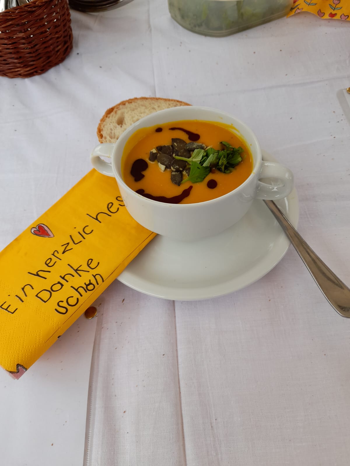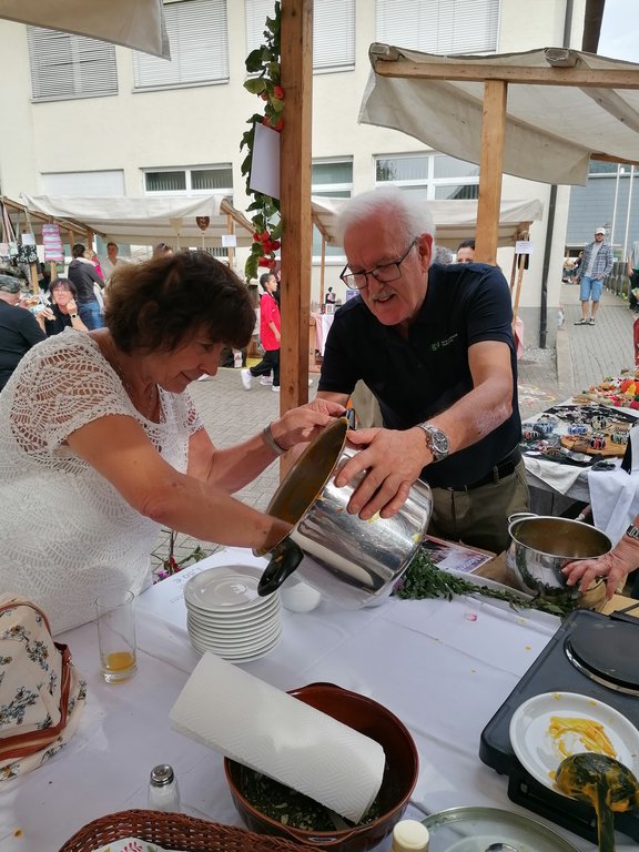 Es gab Süßmost, welcher am Vortag (Hörbranzer Erntedank Fäscht) vor den Zuschauern gepresst wurde, am herbstlich dekorierten Stand. Für die leckere Kürbissuppe nach Thai-Art haben der frisch gebackene Hohenweiler Herbert Holzer, seine Frau Geli und Ruth Heidegger insgesamt 17 kg Kürbisse verarbeitet.
