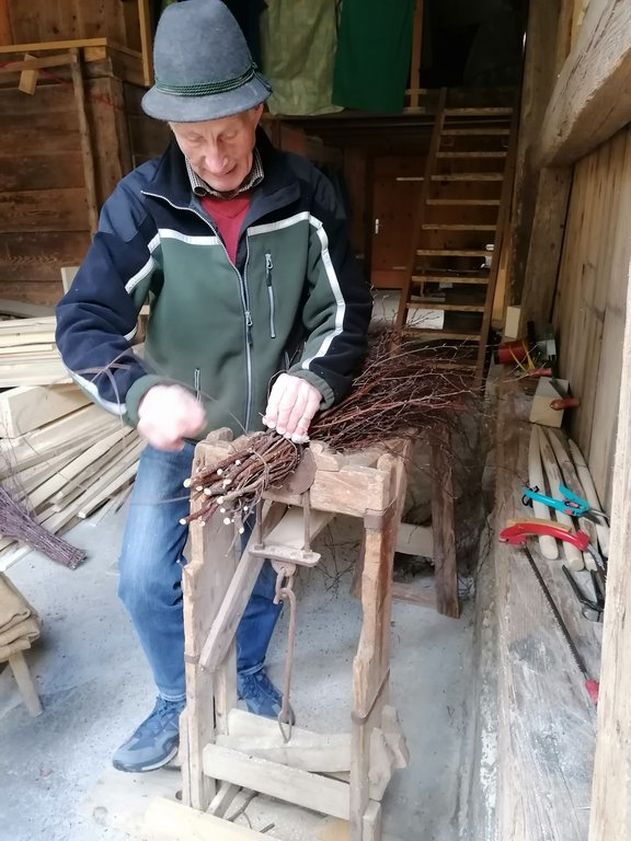- Es wird 3 Jahre altes Birkenreisig verwendet. Das gut 1 m lange Material wird zu einem Büschel (immer wieder etwas drehen) zusammengelegt. Die dickeren Enden zeigen alle in die gleiche Richtung.