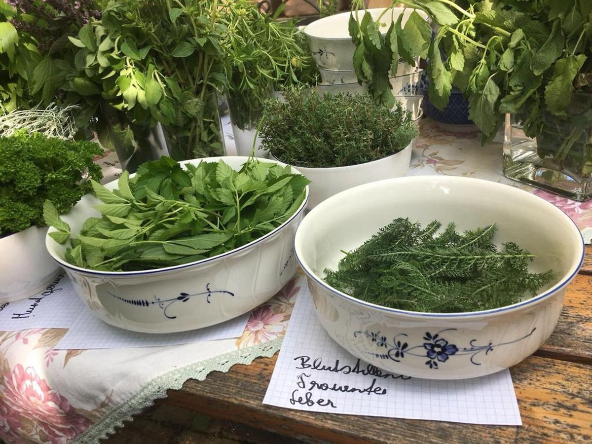Die bereits vorhandenen Kräuter wurden durchgesprochen. Verschiedenen Anwendungen der Kursteilnehmer waren sehr interessant. Gemeinsam sammelten wir noch Girsch und Scharfgarbe, damit auch Wildkräuter vorhanden waren.