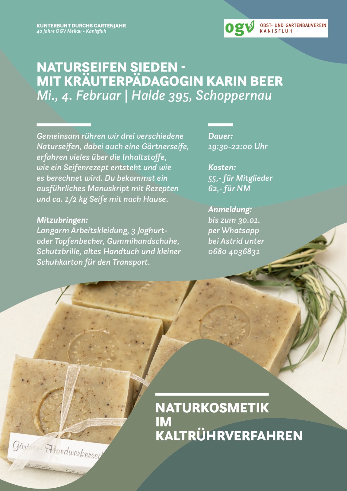 Gemeinsam rühren wir drei verschiedene Naturseifen, dabei auch eine Gärtnerseife, erfahren vieles über die Inhaltstoffe, wie ein Seifenrezept entsteht und wie es berechnet wird. Du bekommst ein ausführliches Manuskript mit Rezepten und ca. 1/2 kg Seife mit nach Hause. Mitzubringen: Langarm Arbeitskleidung, 3 Joghurtoder Topfenbecher, Gummihandschuhe, Schutzbrille, altes Handtuch und kleiner Schuhkarton für den Transport.