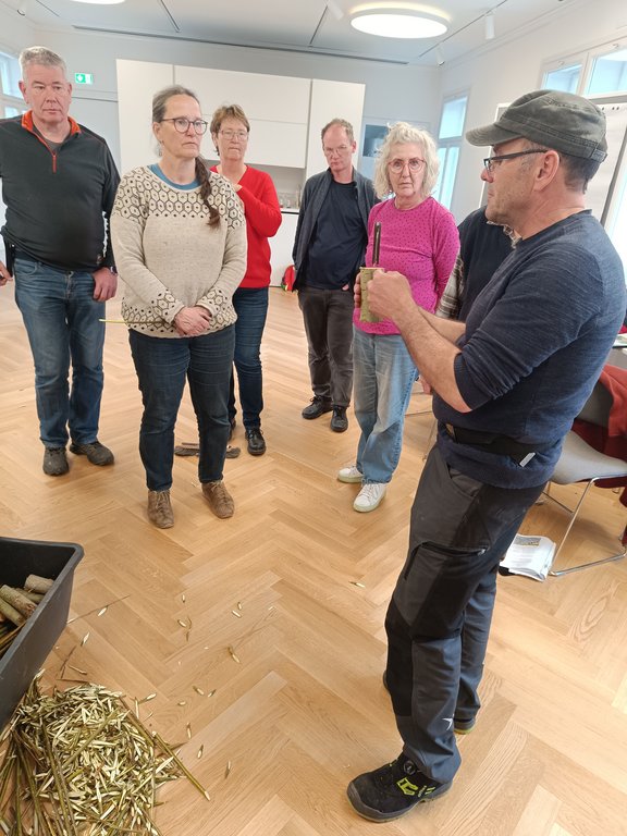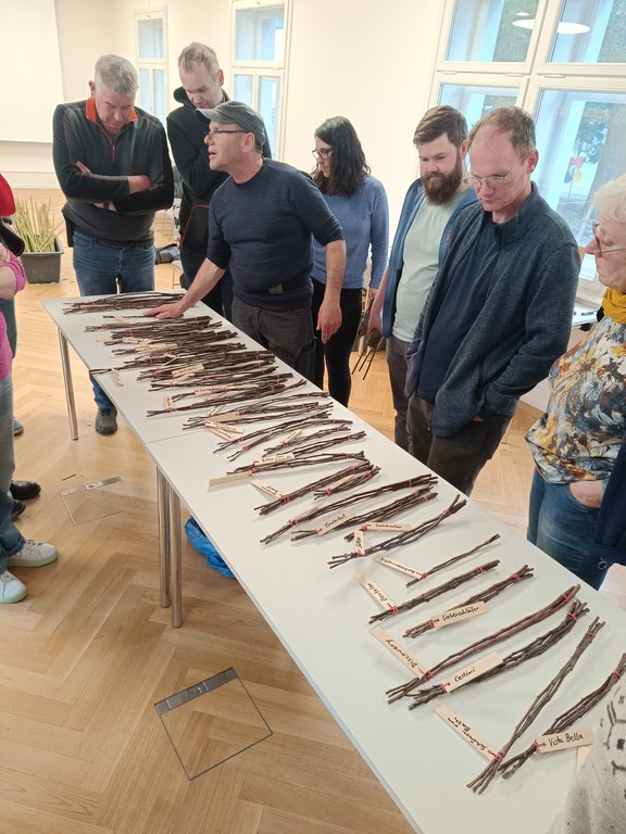 Am Vormittag vermittelte Kursleiter Michael Gunz zunächst die theoretischen Grundlagen. Dabei ging es um verschiedene Veredelungstechniken, die richtige Auswahl von Edelreisern sowie um die Voraussetzungen, damit aus Unterlage und Edelreis ein kräftiger, langlebiger Obstbaum entstehen kann. Die interessierten Teilnehmer:innen nutzten die Gelegenheit für zahlreiche Fragen und Diskussionen.