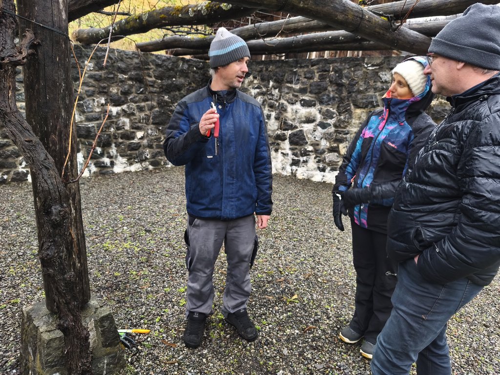 An einem Traubenstock an der Pergola Mauer wurde zudem die Erziehung von Spalierreben am Rankgerüst besprochen. Die Pflege der Ertragsreben zeigte sich anschaulich am Beispiel der Blauburgunder-Traube, bei der ein kräftiger Trieb horizontal befestigt wird.