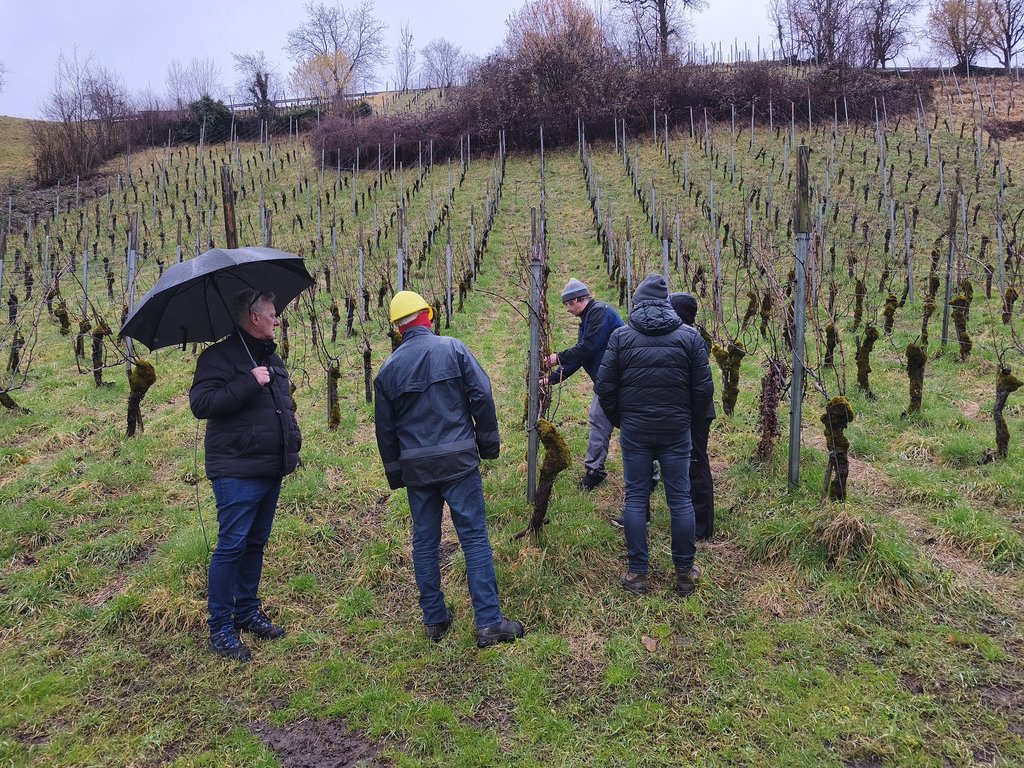 Anschließend startete der praktische Teil beim Rebschnitt an der Pergola. Michael Nachbaur erklärte den Cordon-Schnitt, bei dem Zapfen mit zwei bis drei Augen im Abstand von etwa 20 bis 30 Zentimetern belassen werden.