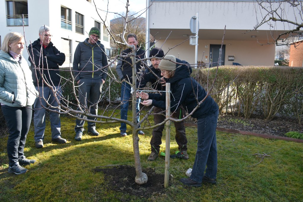 Mit fachkundiger Anleitung beurteilten wir den ersten, den kleinsten Obstbaum im Garten. Der Obstbaum hatte im letzten Jahr sehr viele Äpfel und ein geringes Wachstum. Zu den Pflegemaßnahmen zählen Düngen und Reduzieren der Anzahl der Äpfel. Beim zweiten Obstbaum (Spindel) mit gutem Wachstum ist die Veredelungsstelle teils in der Erde und musste freigelegt werden. Einige Äste wurden waagrecht herunter gebunden, um das Wachstum zu reduzieren und die Knospenbildung zu fördern. Beim dritten Baum (Birnbaum) wurden einige Äste entfernt (Auslichten), damit Licht und Luft zu allen Blättern gelangt, um Krankheiten vorzubeugen.