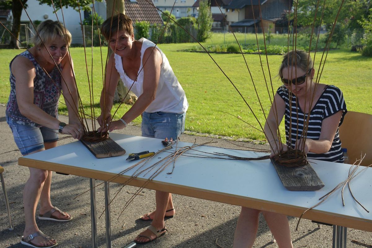 Am Dienstag, den 25.6.2019 fand bereits der 4. Flechtkurs mit Renate und Sigrid auf dem Schulhof der Volksschule Sulz statt. Bei herrlich heißen Temperaturen wurden aus vorbereiteten Weidenruten und Holzunterlagen Pflanzgefäße und Windlichter geflochten. Die TeilnehmerInnen waren bei bester Laune, natürlich wegen des großartigen Wetters und auch, weil die meisten schon wussten, dass wieder wunderschöne Objekte gefertigt werden.