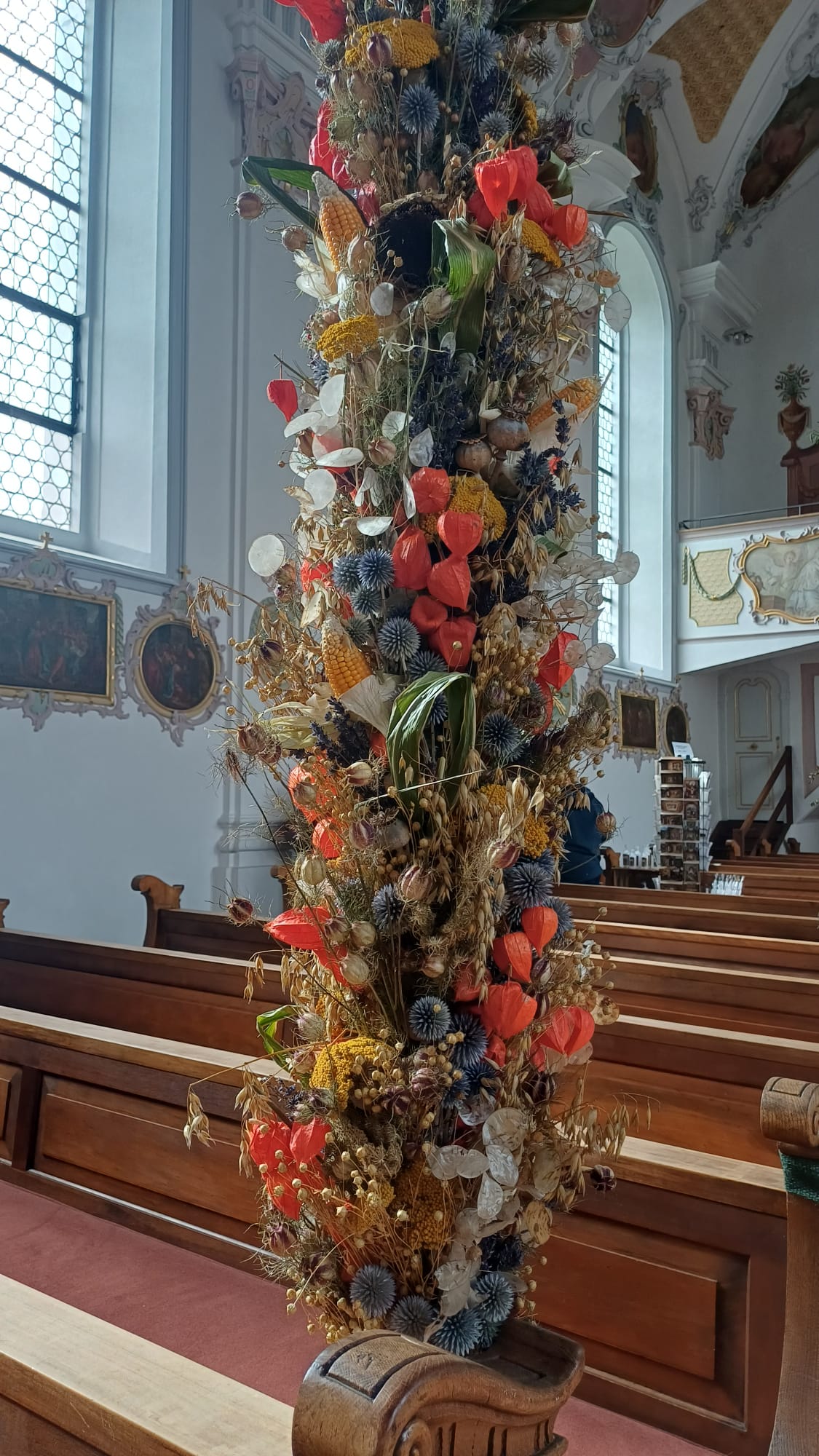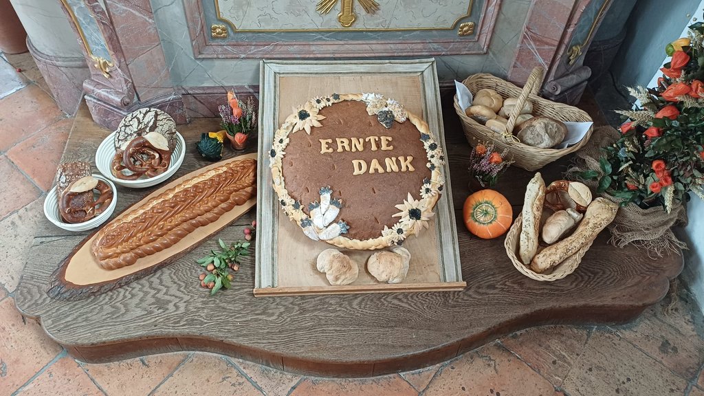 Dort haben wir als erste Station die Pfarrkirche St. Oswald besucht. Diese war mit einem kunstvollen Erntedankteppich, hergestellt aus verschiedenen Früchten und Samen, zum Erntedank festlich dekoriert.