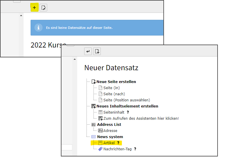 Alternativ kann ein neuer Eintrag auch über das kleinere + Symbol im oberen Bereich angelegt werden, hier muss nach dem Anklicken des + Symbols die Option Artikel ausgewählt werden.