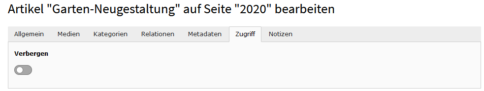 Unter dem Reiter Zugriff kann festgelegt werden, ob ein Artikel auf der Webseite angezeigt wird oder nicht.